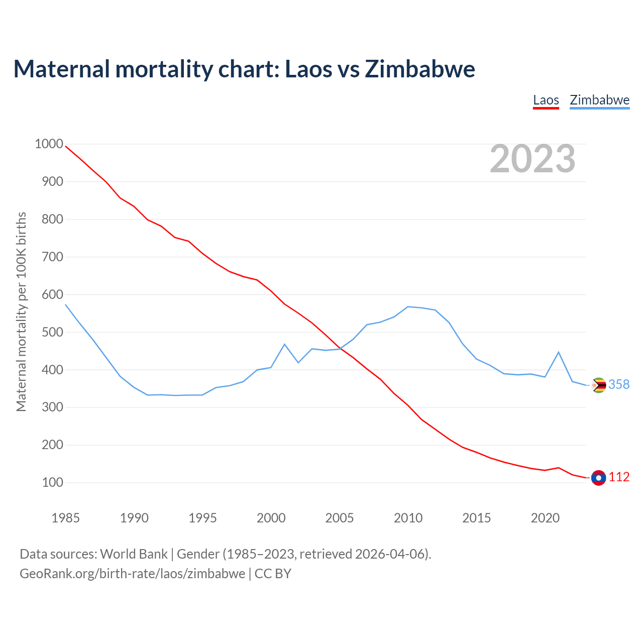 The maternal mortality rate, which is the probability of dying during childbirth or within 42 days of pregnancy termination, is 112 deaths per 100,000 live births in Laos, compared to 358 deaths in Zimbabwe.