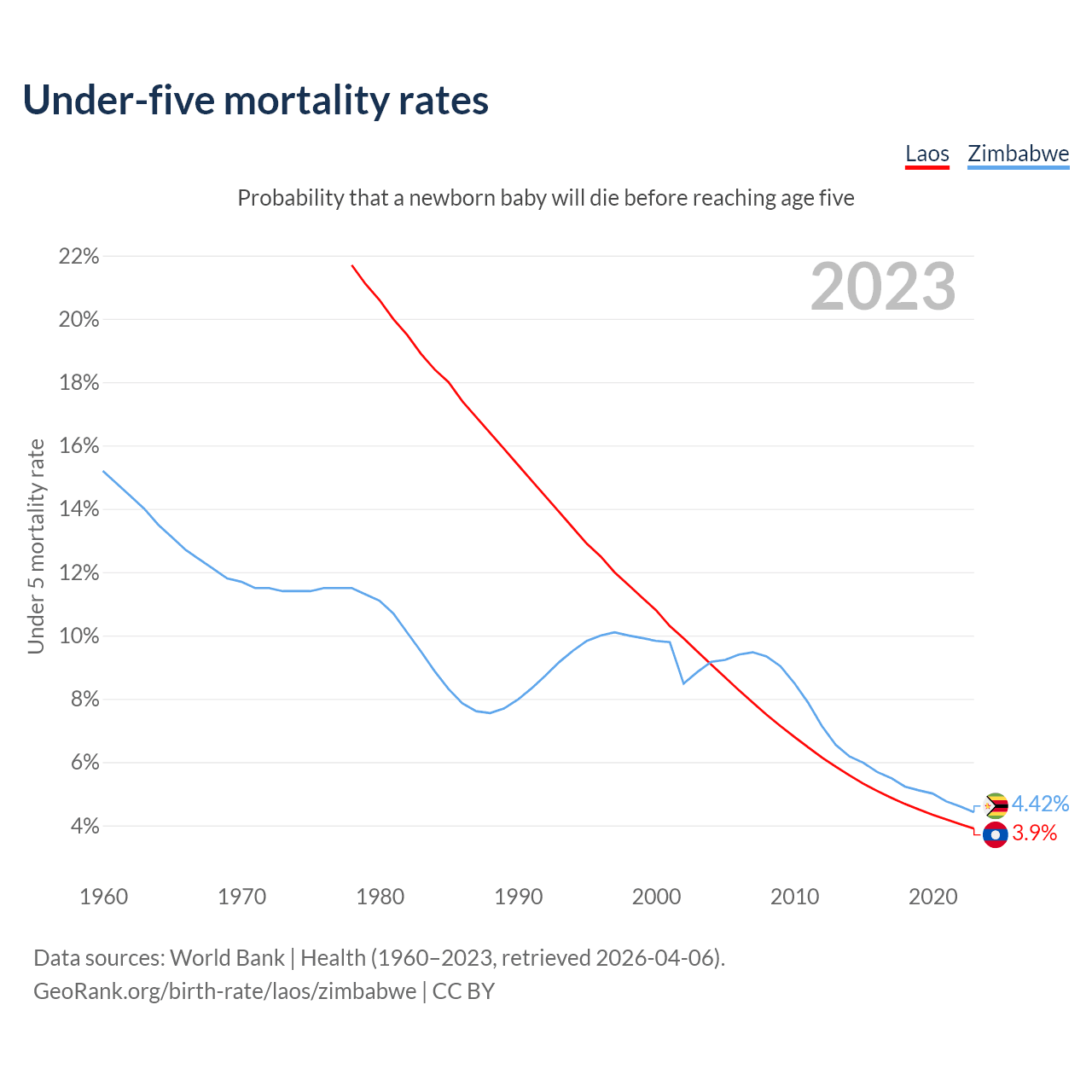 The chance that a newborn baby will die before reaching age five is 3.9% in Laos and 4.42% in Zimbabwe. Above is a chart with historical data on under-five mortality rates.