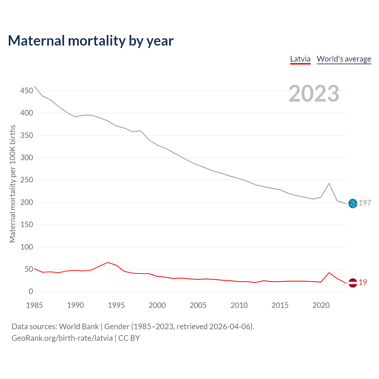 The maternal mortality rate in Latvia was 19 deaths per 100,000 live births in 2023 — a 0.02% chance of dying during childbirth or within 42 days of pregnancy termination. This is a 44.1% decrease compared to the year 2000.