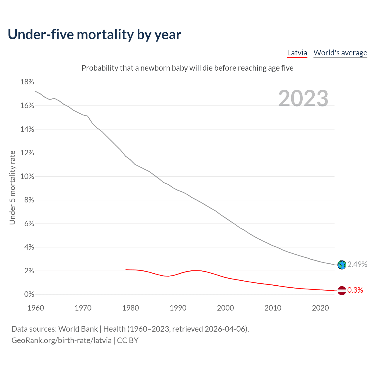 The under-5 mortality rate in Latvia was 3 deaths per 1,000 live births in 2023 — a 0.3% chance that a newborn baby will die before reaching age five. This is down from 14.2 deaths per 1,000 live births in 2000.