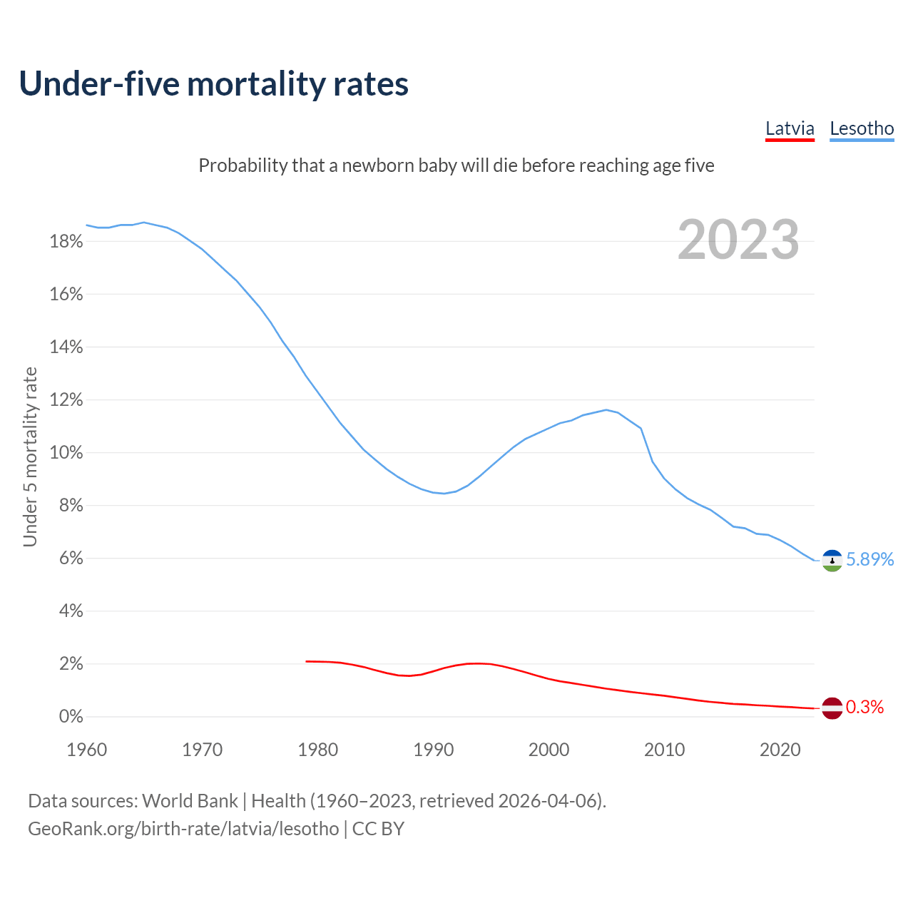 The chance that a newborn baby will die before reaching age five is 0.3% in Latvia and 5.89% in Lesotho. Above is a chart with historical data on under-five mortality rates.