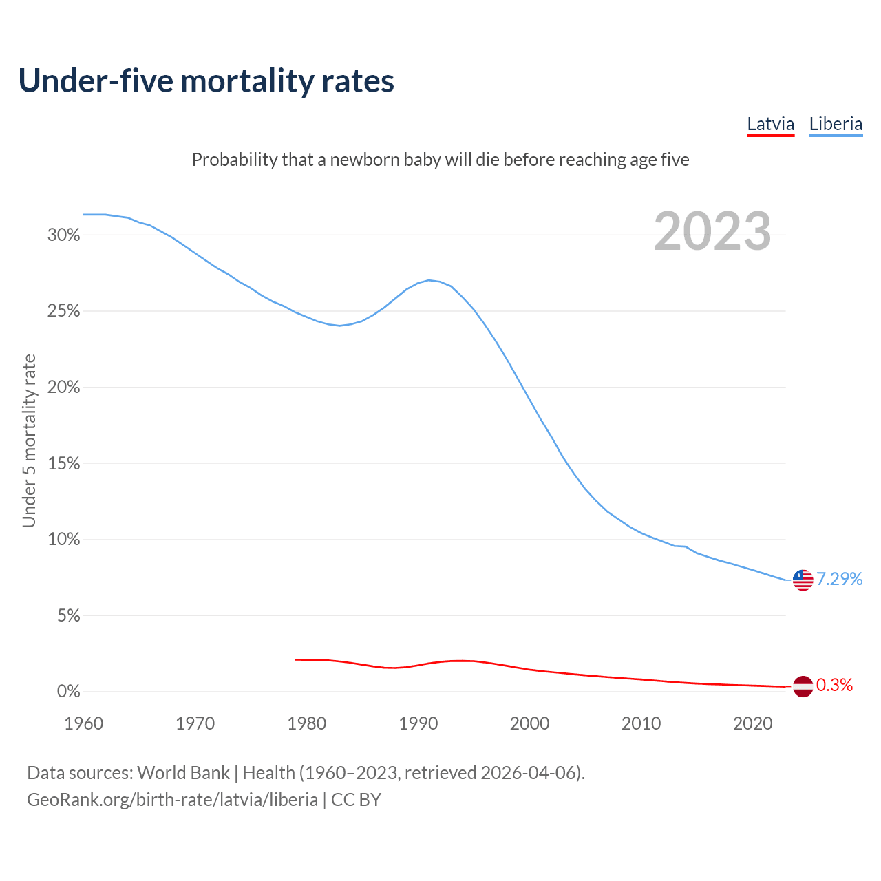 The chance that a newborn baby will die before reaching age five is 0.3% in Latvia and 7.29% in Liberia. Above is a chart with historical data on under-five mortality rates.