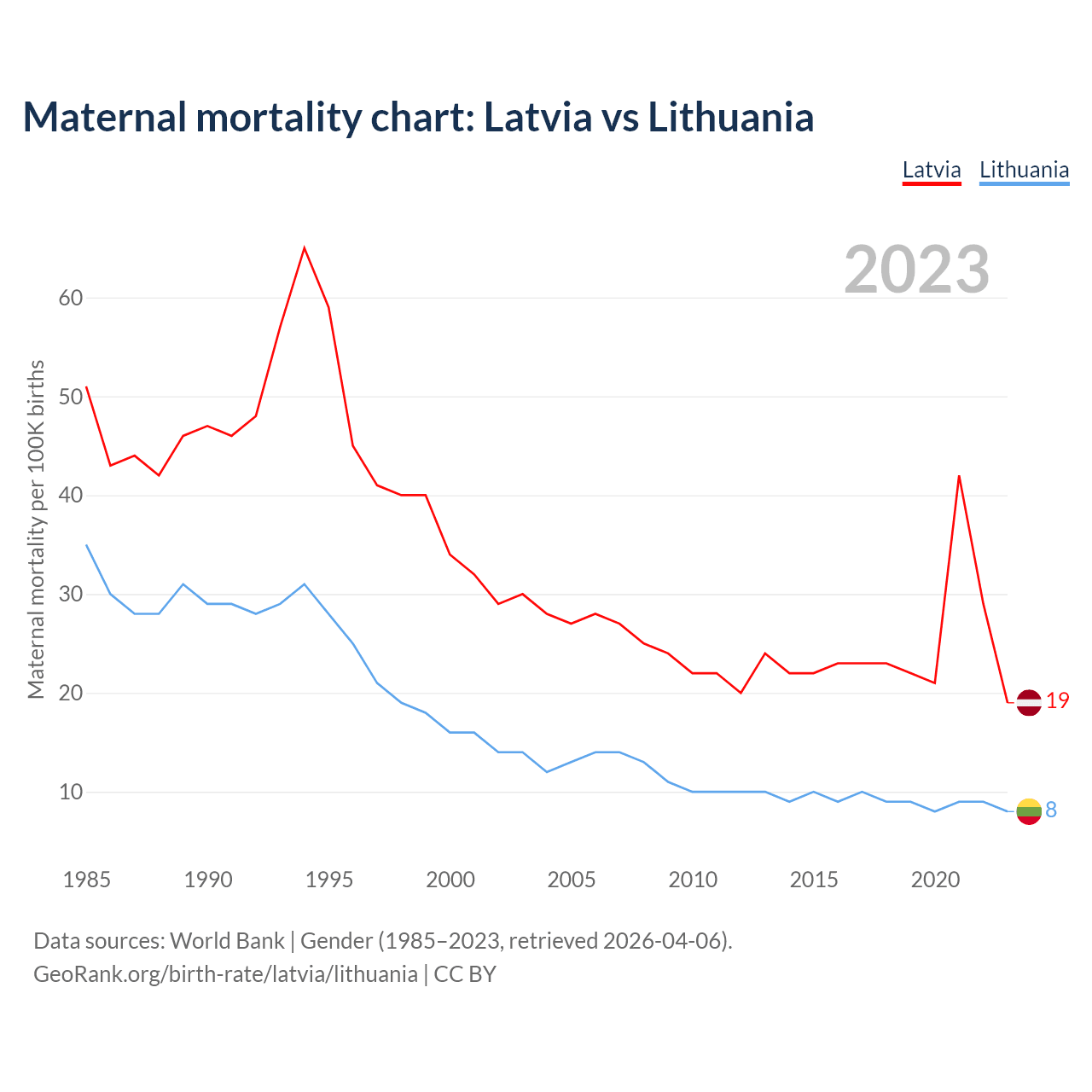 The maternal mortality rate, which is the probability of dying during childbirth or within 42 days of pregnancy termination, is 19 deaths per 100,000 live births in Latvia, compared to 8 deaths in Lithuania.