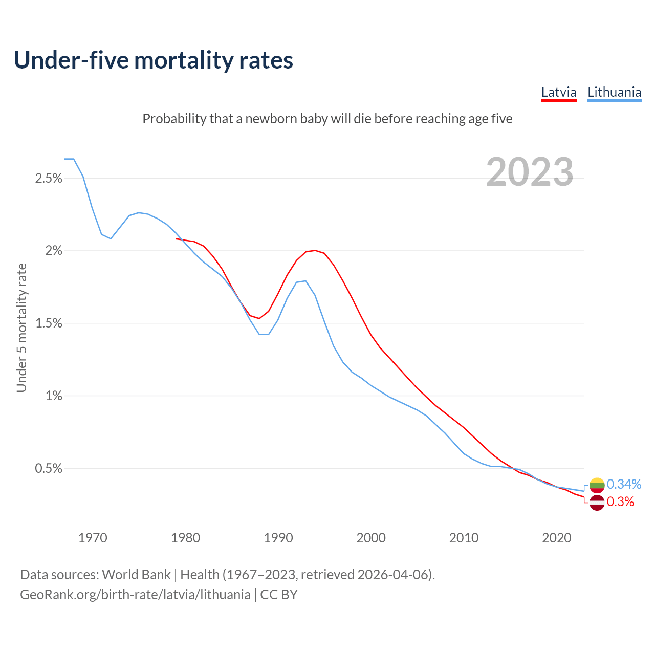 The chance that a newborn baby will die before reaching age five is 0.3% in Latvia and 0.34% in Lithuania. Above is a chart with historical data on under-five mortality rates.