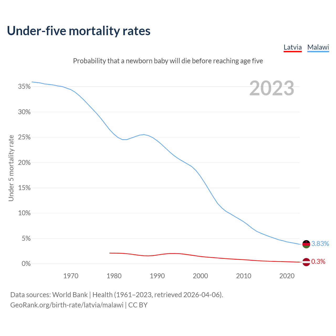 The chance that a newborn baby will die before reaching age five is 0.3% in Latvia and 3.83% in Malawi. Above is a chart with historical data on under-five mortality rates.