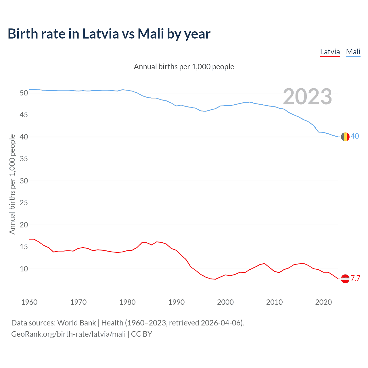 Latvia has an annual birth rate of 7.7 births per 1,000 people, compared to 40 for Mali. The average number of children a woman is expected to have during her lifetime — the fertility rate, is 1.36 in Latvia and 5.61 in Mali — 313% difference.