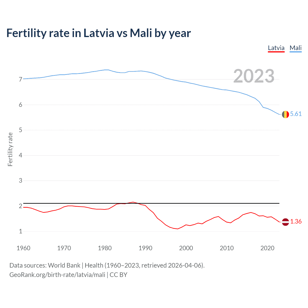 1960 vs 2023, the fertility rate has decreased by 29.9% in Latvia and by 20% in Mali — in 1960, it was 1.94 and 7.02, respectively.