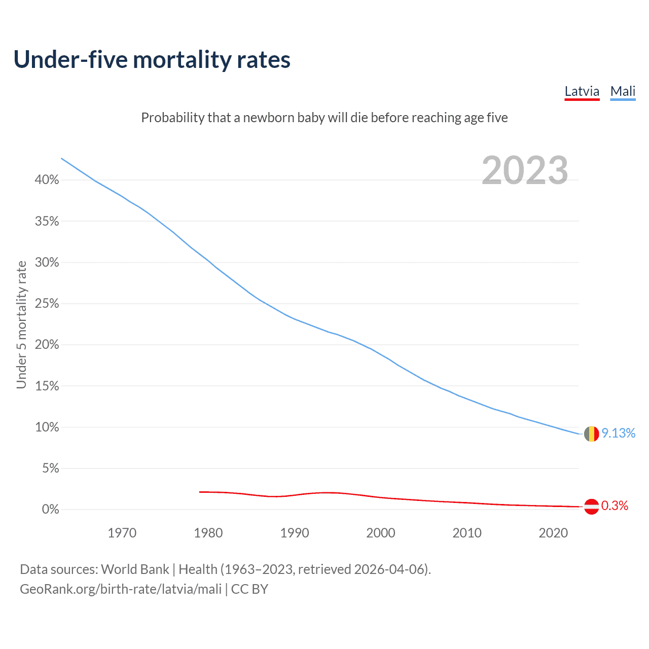 The chance that a newborn baby will die before reaching age five is 0.3% in Latvia and 9.13% in Mali. Above is a chart with historical data on under-five mortality rates.