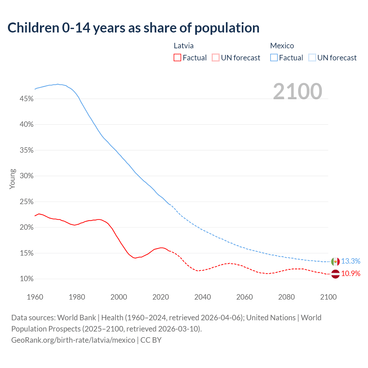 According to the latest available data on birth rates, the fertility rate in Latvia was 1.36 children per woman in 2023, compared to 1.91 in Mexico in 2023. The replacement level is considered to be 2.1 children per woman.