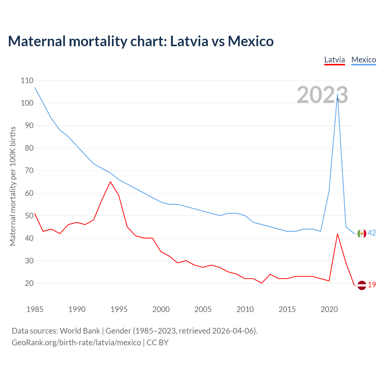 The maternal mortality rate, which is the probability of dying during childbirth or within 42 days of pregnancy termination, is 19 deaths per 100,000 live births in Latvia, compared to 42 deaths in Mexico.