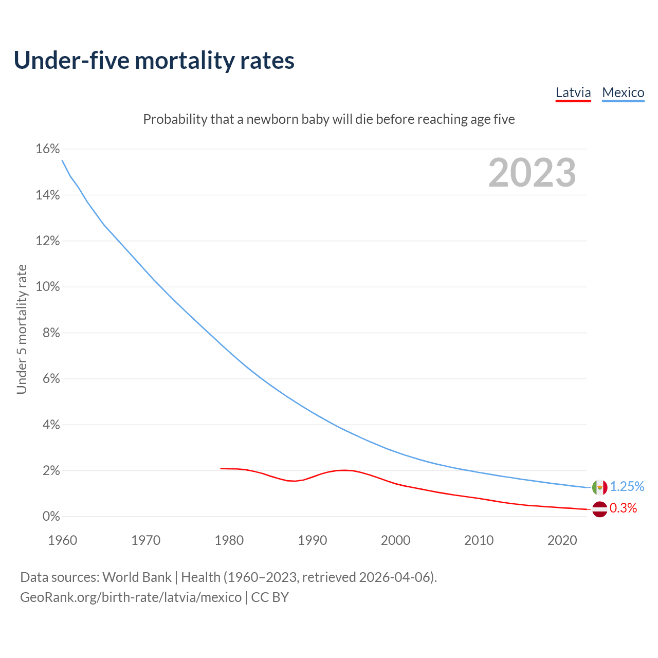 The chance that a newborn baby will die before reaching age five is 0.3% in Latvia and 1.25% in Mexico. Above is a chart with historical data on under-five mortality rates.