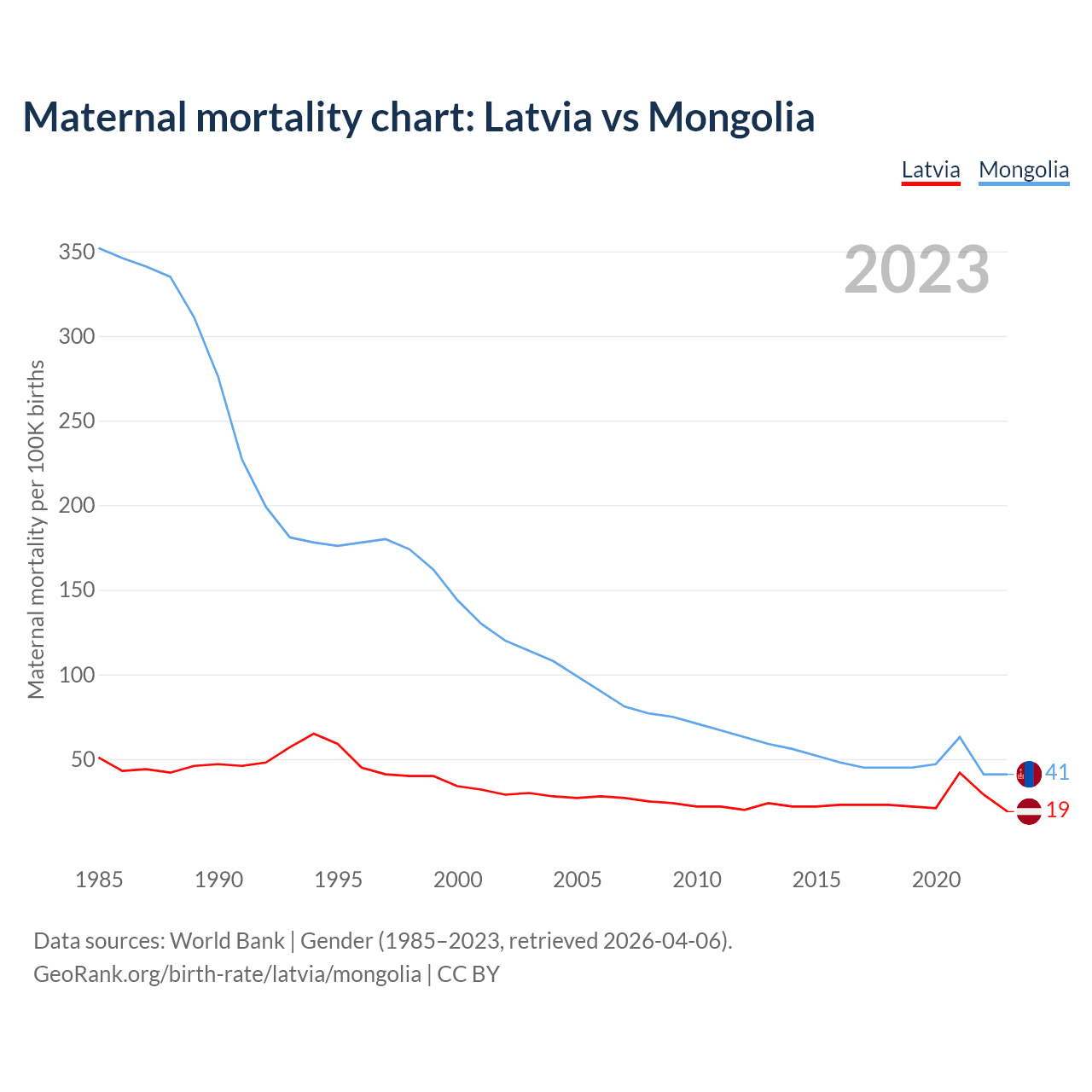The maternal mortality rate, which is the probability of dying during childbirth or within 42 days of pregnancy termination, is 19 deaths per 100,000 live births in Latvia, compared to 41 deaths in Mongolia.