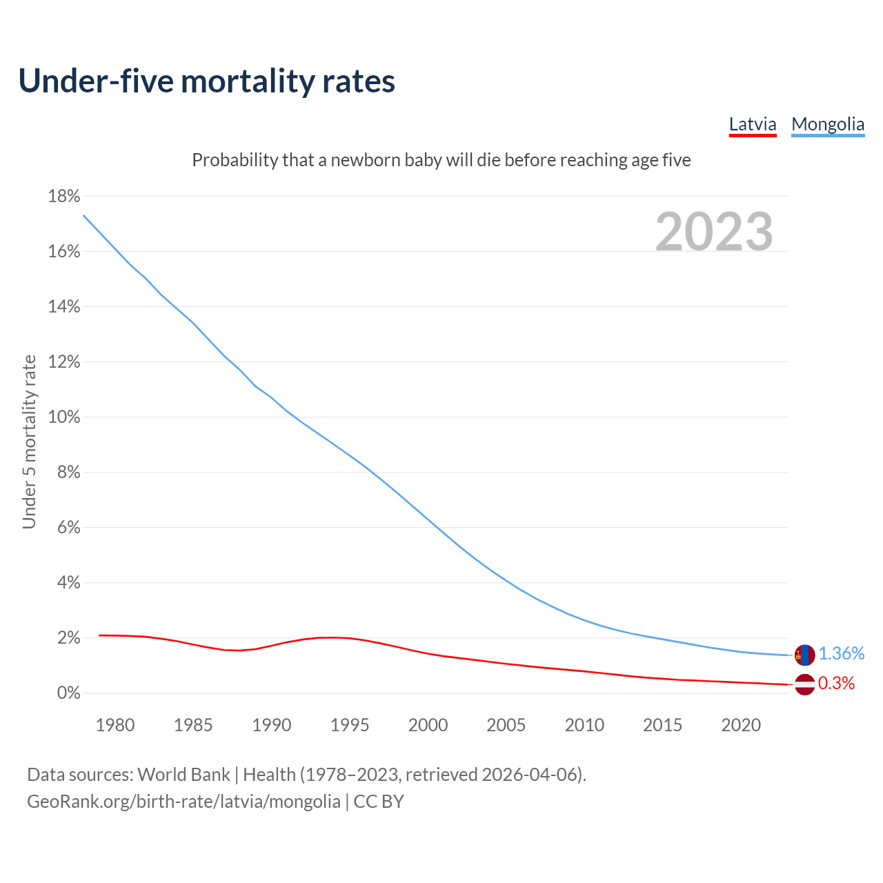 The chance that a newborn baby will die before reaching age five is 0.3% in Latvia and 1.36% in Mongolia. Above is a chart with historical data on under-five mortality rates.