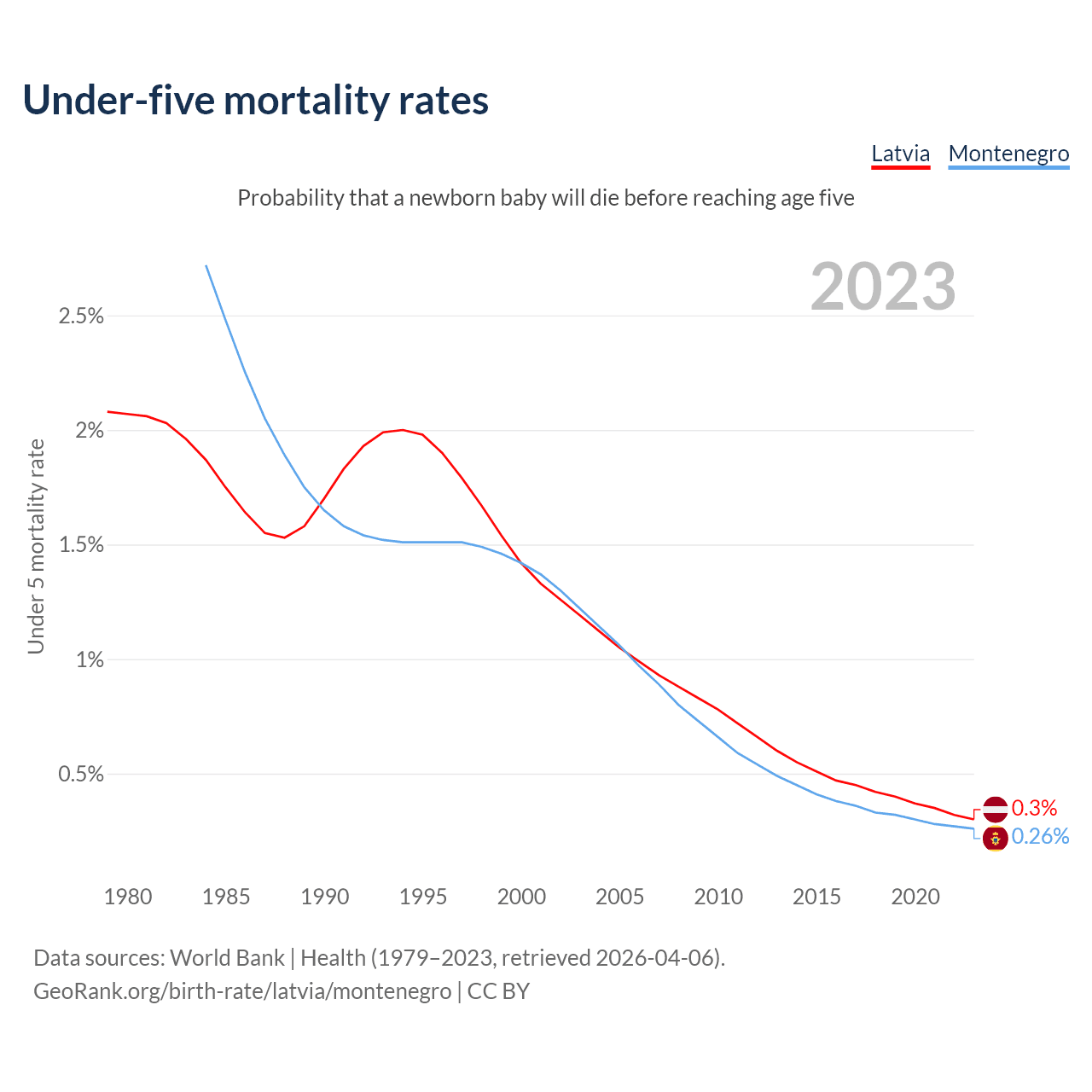 The chance that a newborn baby will die before reaching age five is 0.3% in Latvia and 0.26% in Montenegro. Above is a chart with historical data on under-five mortality rates.