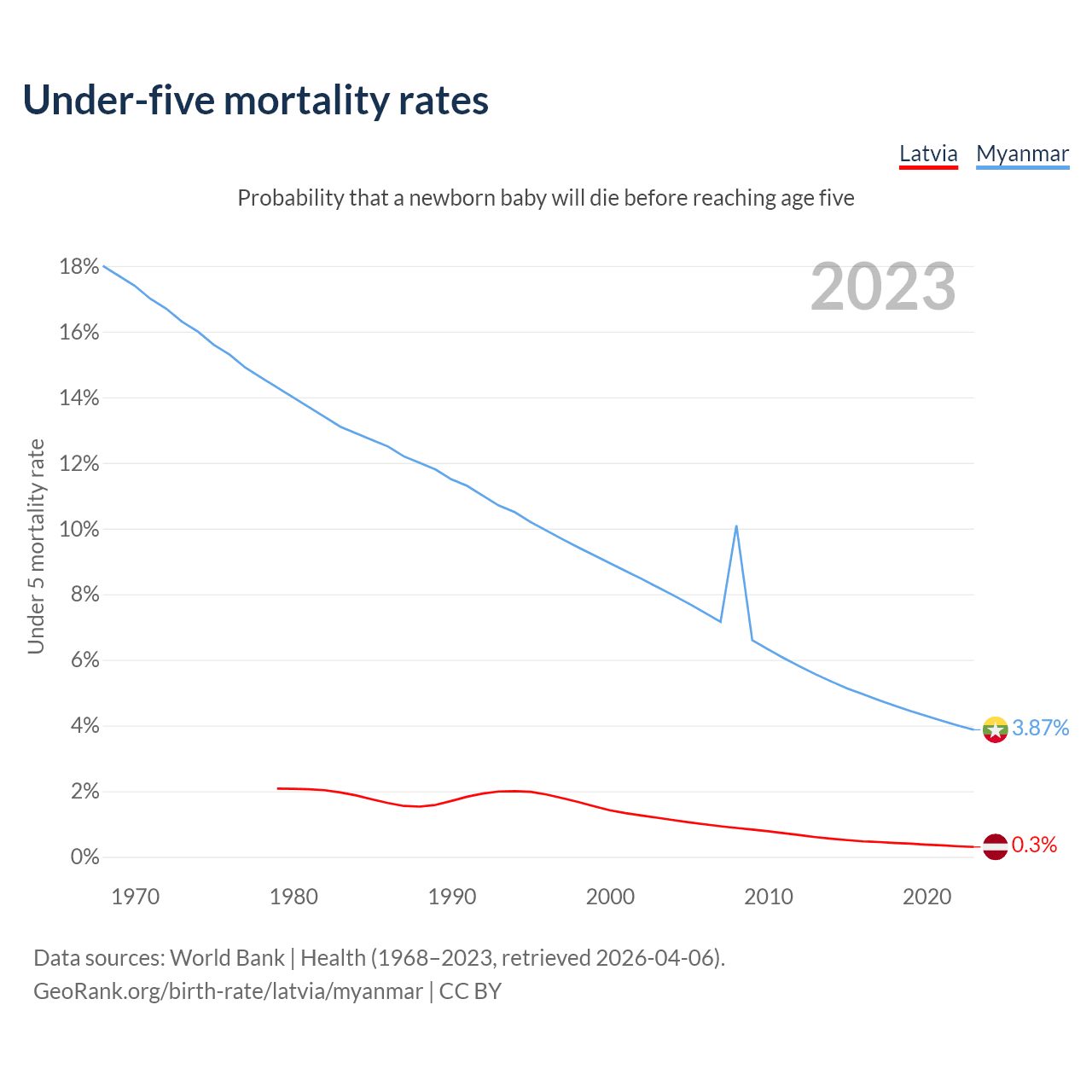 The chance that a newborn baby will die before reaching age five is 0.3% in Latvia and 3.87% in Myanmar. Above is a chart with historical data on under-five mortality rates.