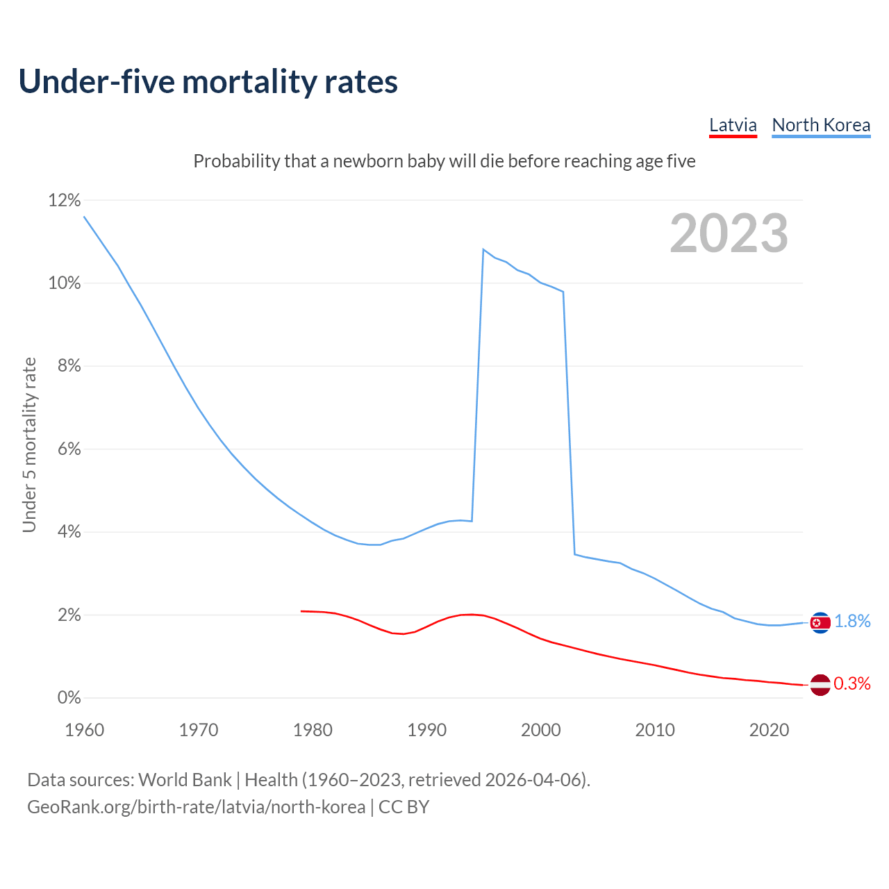 The chance that a newborn baby will die before reaching age five is 0.3% in Latvia and 1.8% in North Korea. Above is a chart with historical data on under-five mortality rates.