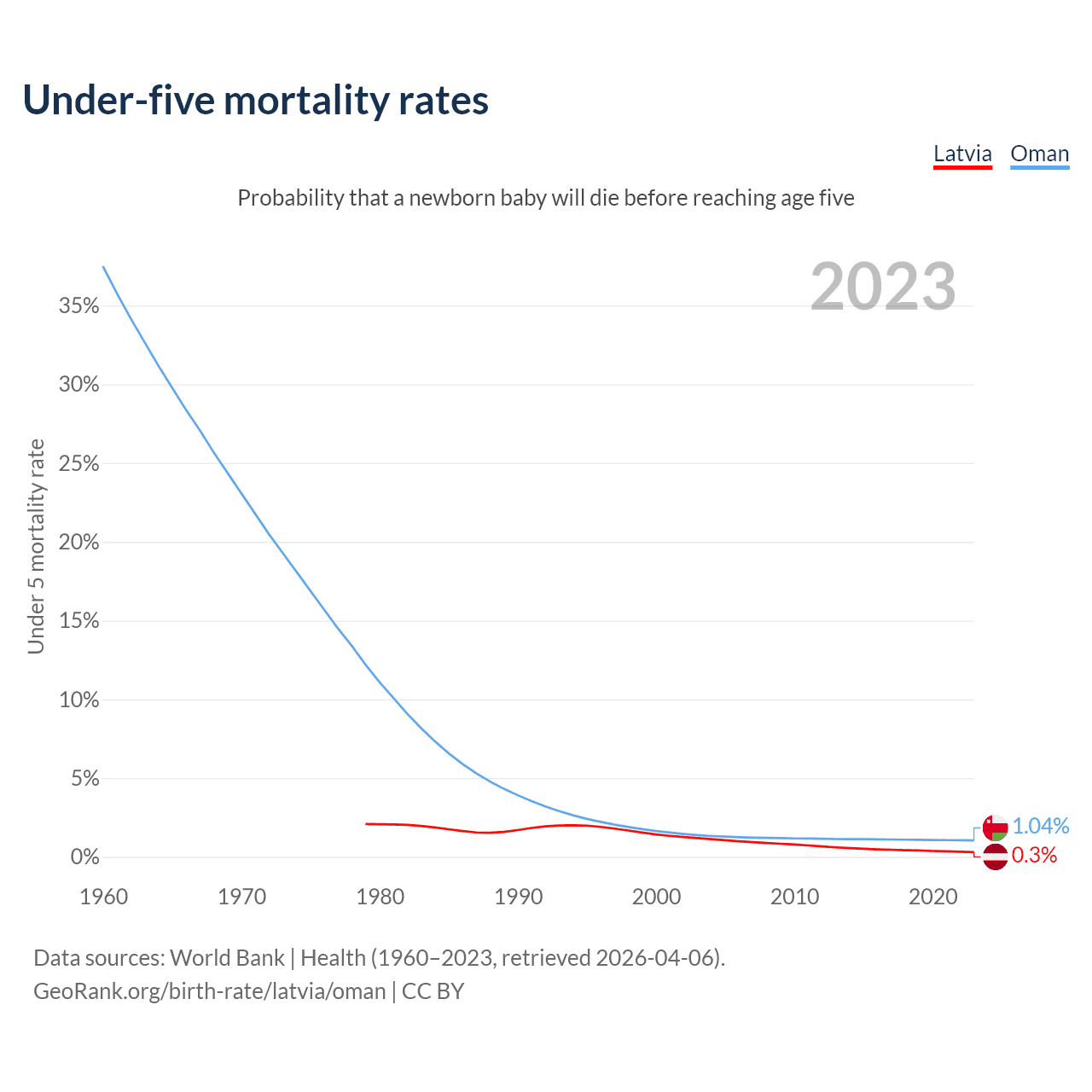 The chance that a newborn baby will die before reaching age five is 0.3% in Latvia and 1.04% in Oman. Above is a chart with historical data on under-five mortality rates.