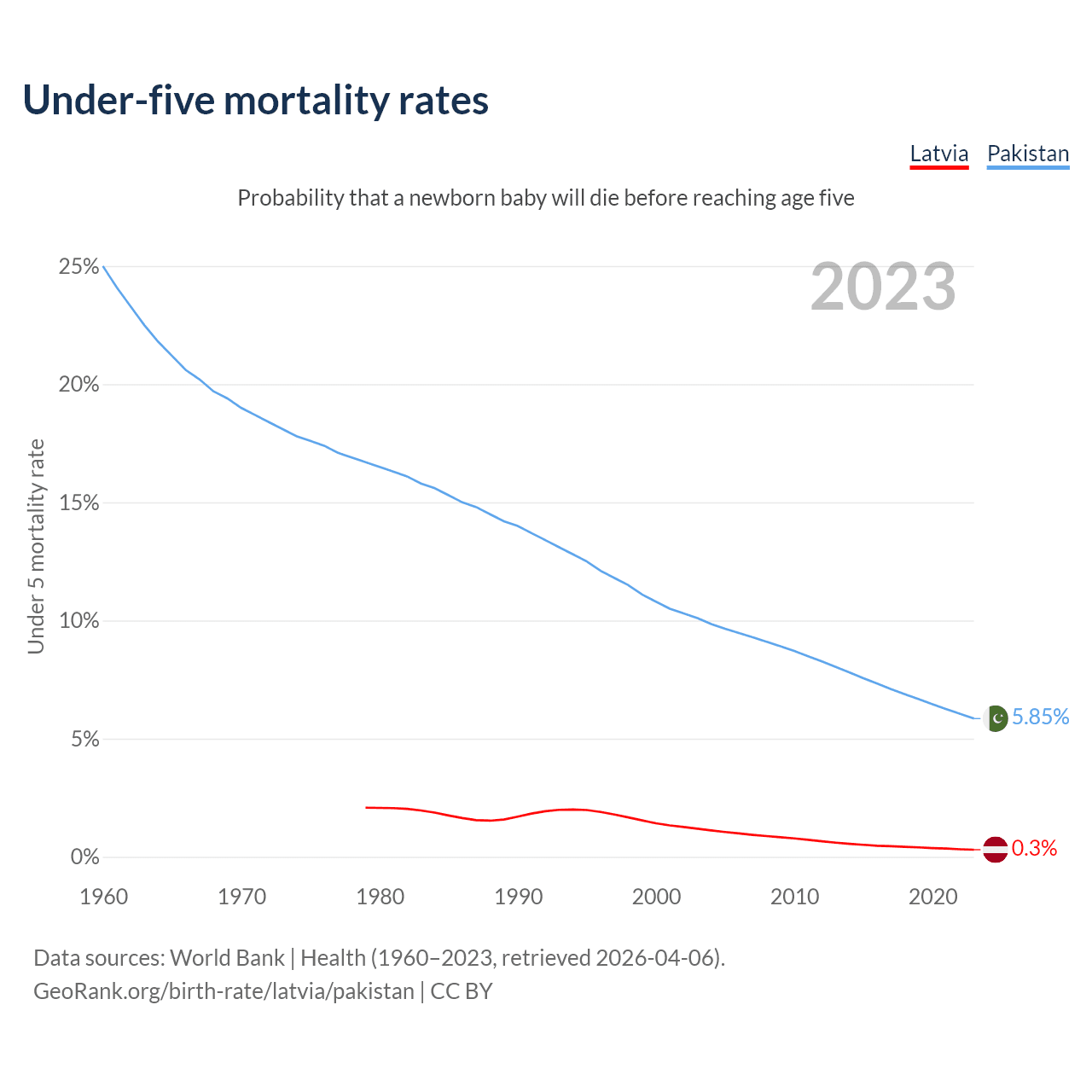 The chance that a newborn baby will die before reaching age five is 0.3% in Latvia and 5.85% in Pakistan. Above is a chart with historical data on under-five mortality rates.