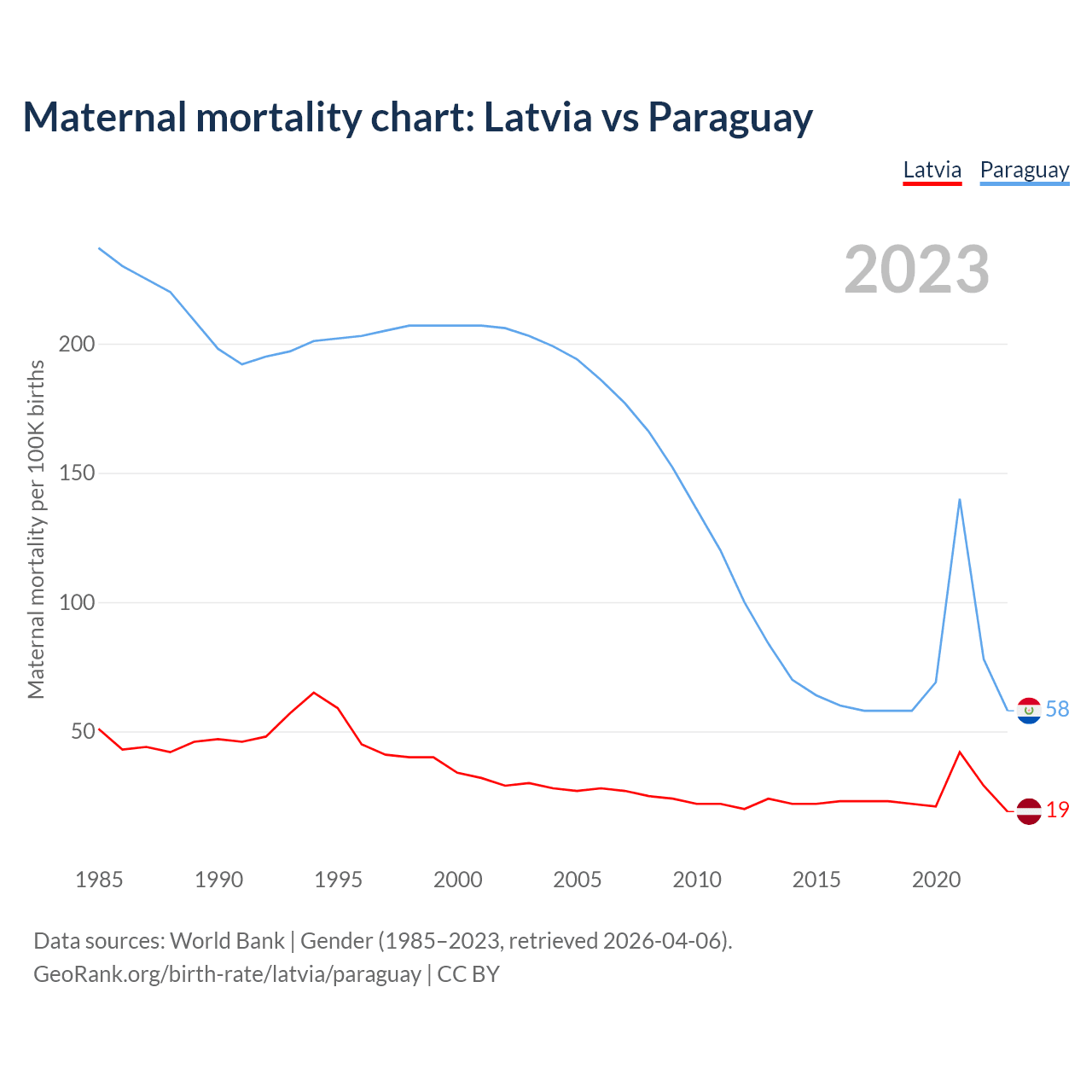 The maternal mortality rate, which is the probability of dying during childbirth or within 42 days of pregnancy termination, is 19 deaths per 100,000 live births in Latvia, compared to 58 deaths in Paraguay.