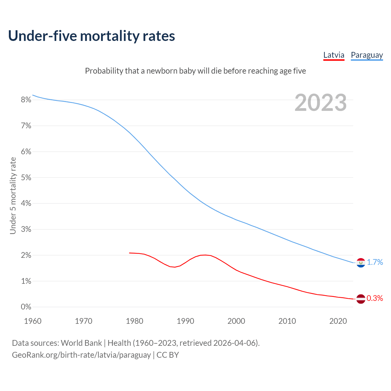 The chance that a newborn baby will die before reaching age five is 0.3% in Latvia and 1.7% in Paraguay. Above is a chart with historical data on under-five mortality rates.