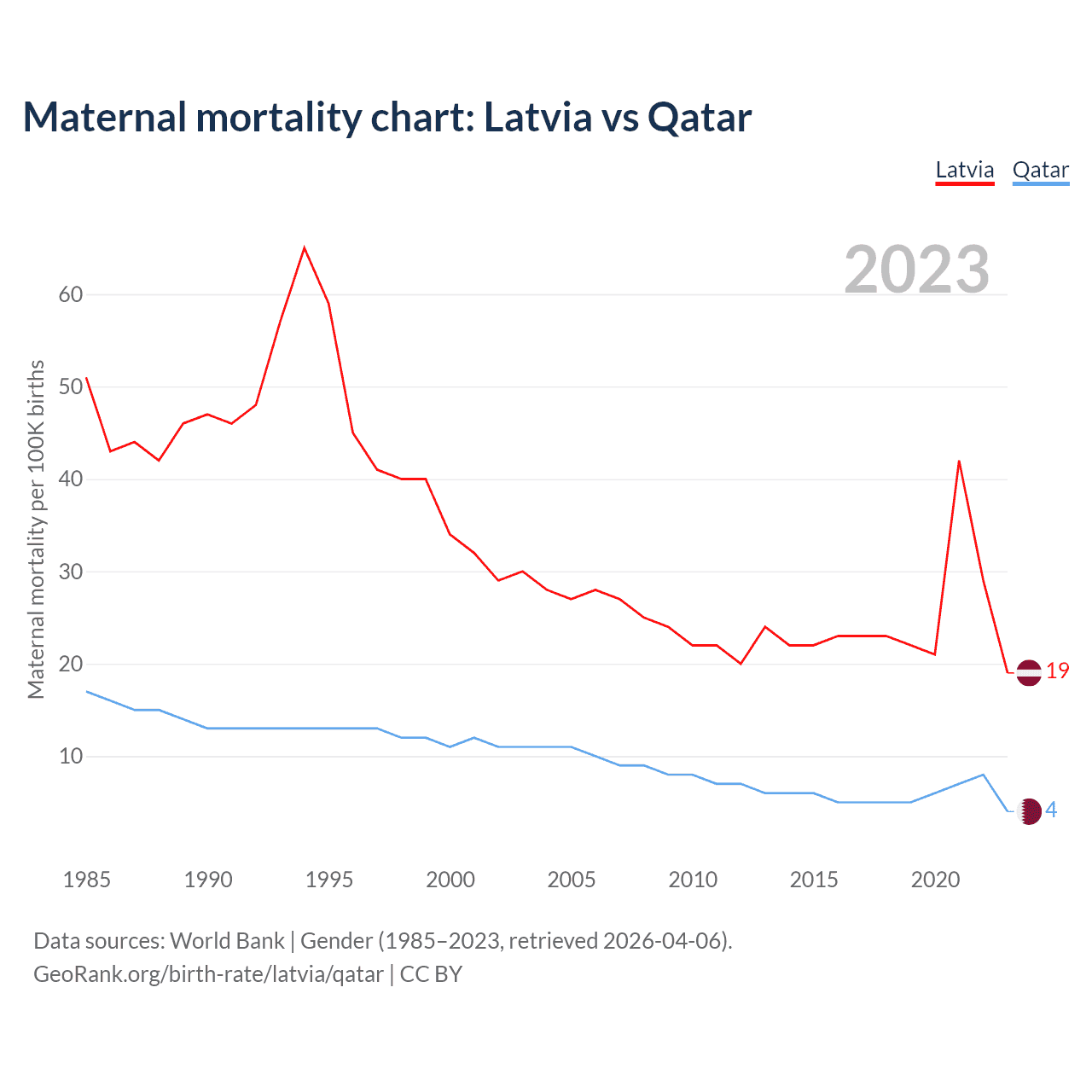 The maternal mortality rate, which is the probability of dying during childbirth or within 42 days of pregnancy termination, is 19 deaths per 100,000 live births in Latvia, compared to 4 deaths in Qatar.