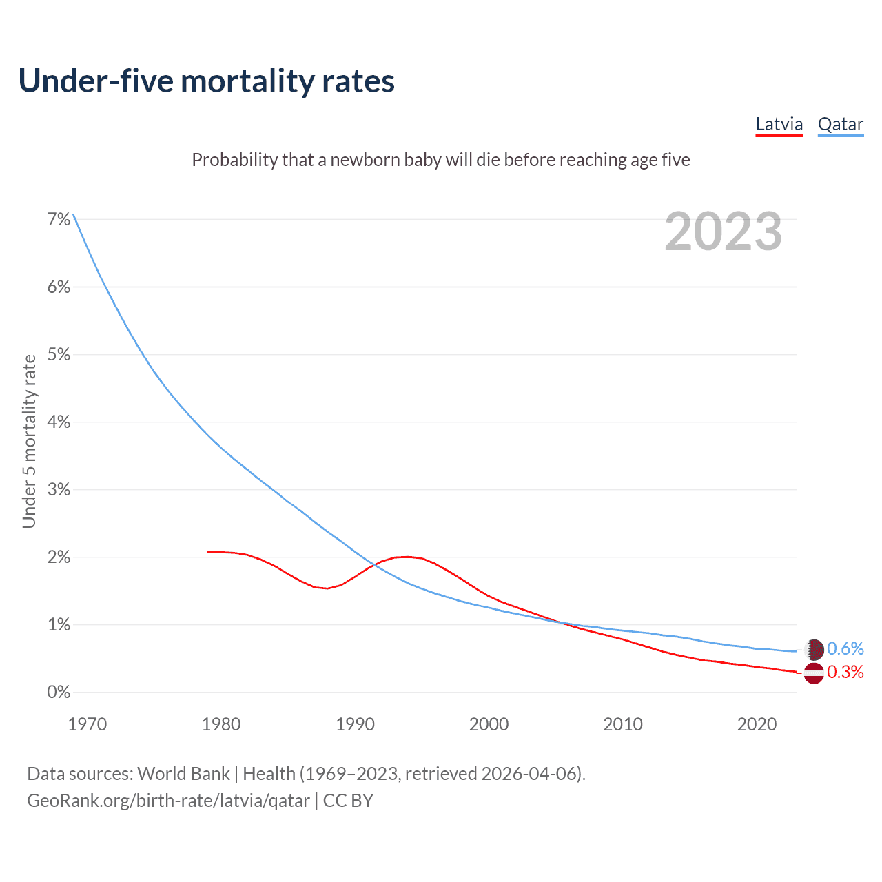 The chance that a newborn baby will die before reaching age five is 0.3% in Latvia and 0.6% in Qatar. Above is a chart with historical data on under-five mortality rates.