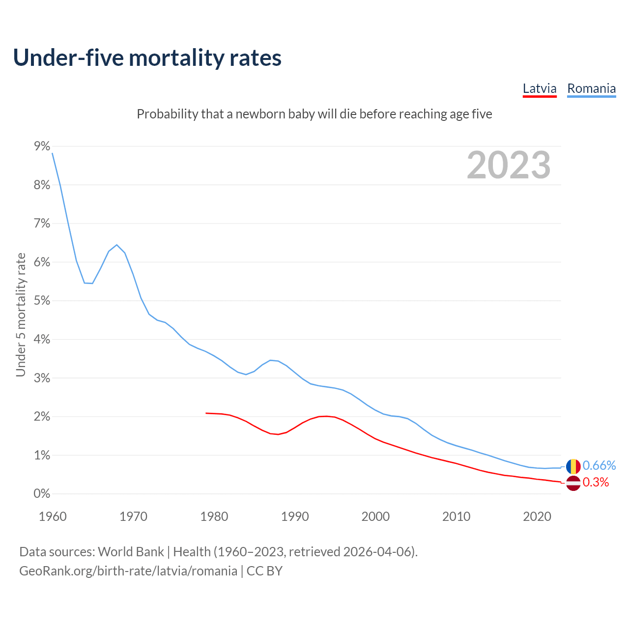 The chance that a newborn baby will die before reaching age five is 0.3% in Latvia and 0.66% in Romania. Above is a chart with historical data on under-five mortality rates.