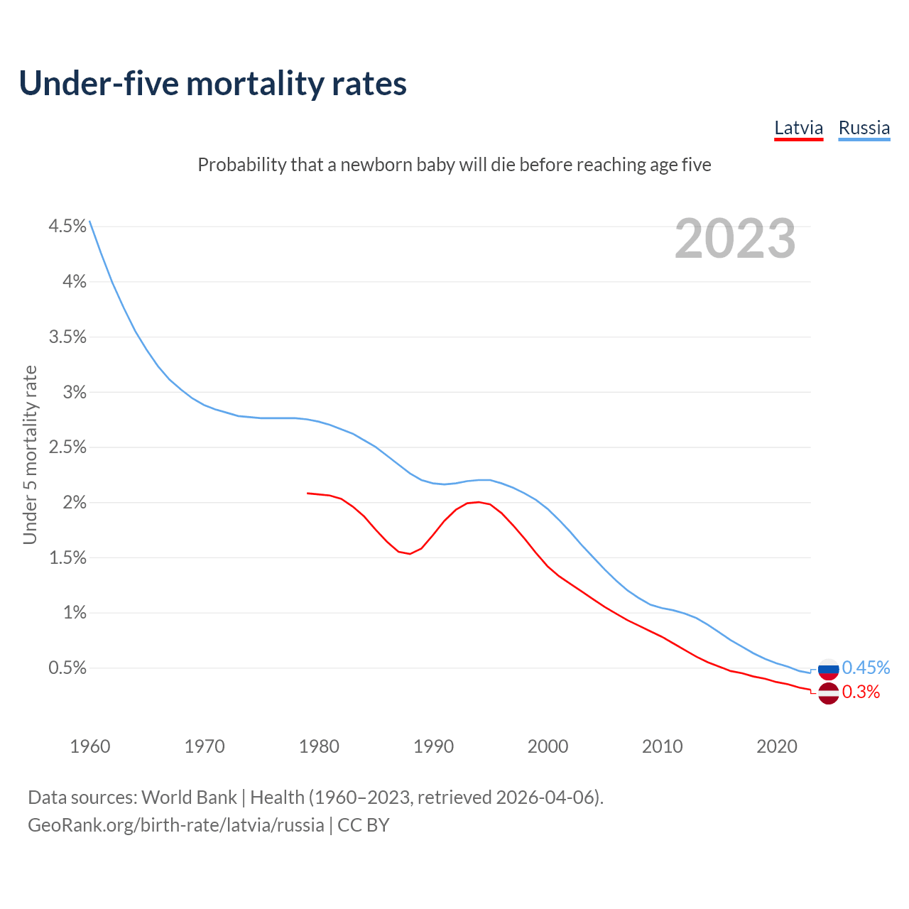 The chance that a newborn baby will die before reaching age five is 0.3% in Latvia and 0.45% in Russia. Above is a chart with historical data on under-five mortality rates.