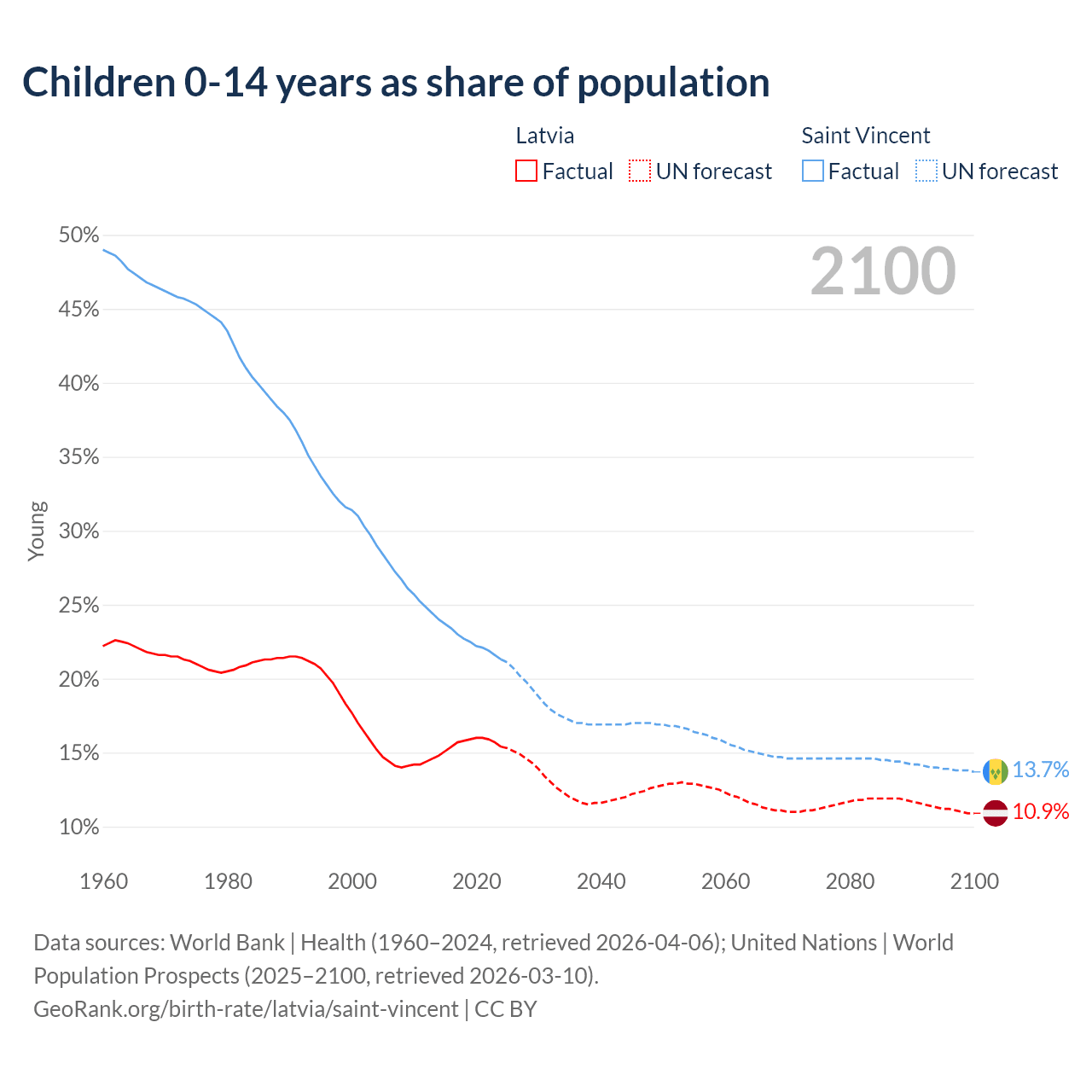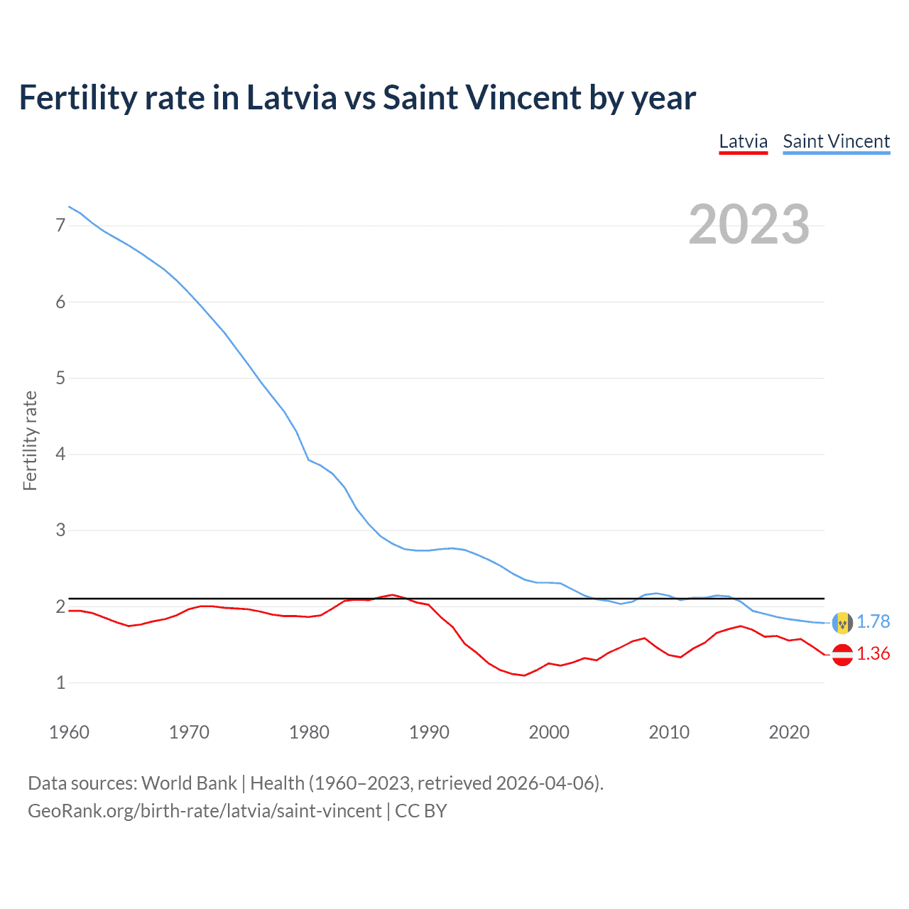 According to the latest available data on birth rates, the fertility rate in Latvia was 1.36 children per woman in 2023, compared to 1.78 in Saint Vincent in 2023. The replacement level is considered to be 2.1 children per woman.