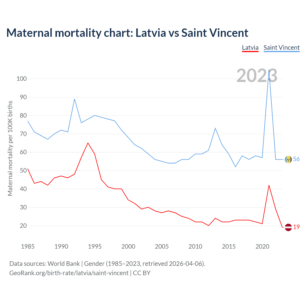 The maternal mortality rate, which is the probability of dying during childbirth or within 42 days of pregnancy termination, is 19 deaths per 100,000 live births in Latvia, compared to 56 deaths in Saint Vincent.