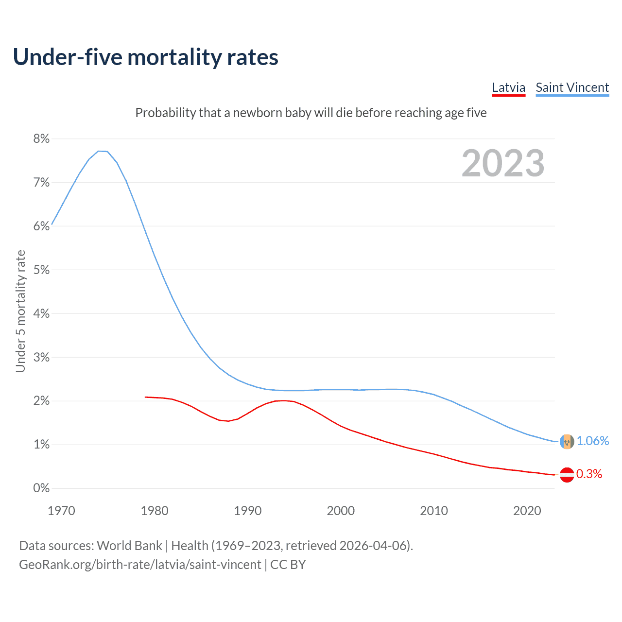 The chance that a newborn baby will die before reaching age five is 0.3% in Latvia and 1.06% in Saint Vincent. Above is a chart with historical data on under-five mortality rates.