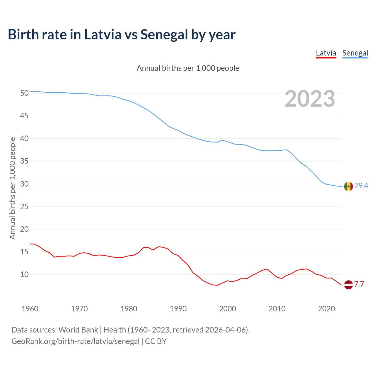 Latvia has an annual birth rate of 7.7 births per 1,000 people, compared to 29.4 for Senegal. The average number of children a woman is expected to have during her lifetime — the fertility rate, is 1.36 in Latvia and 3.82 in Senegal — 180.7% difference.