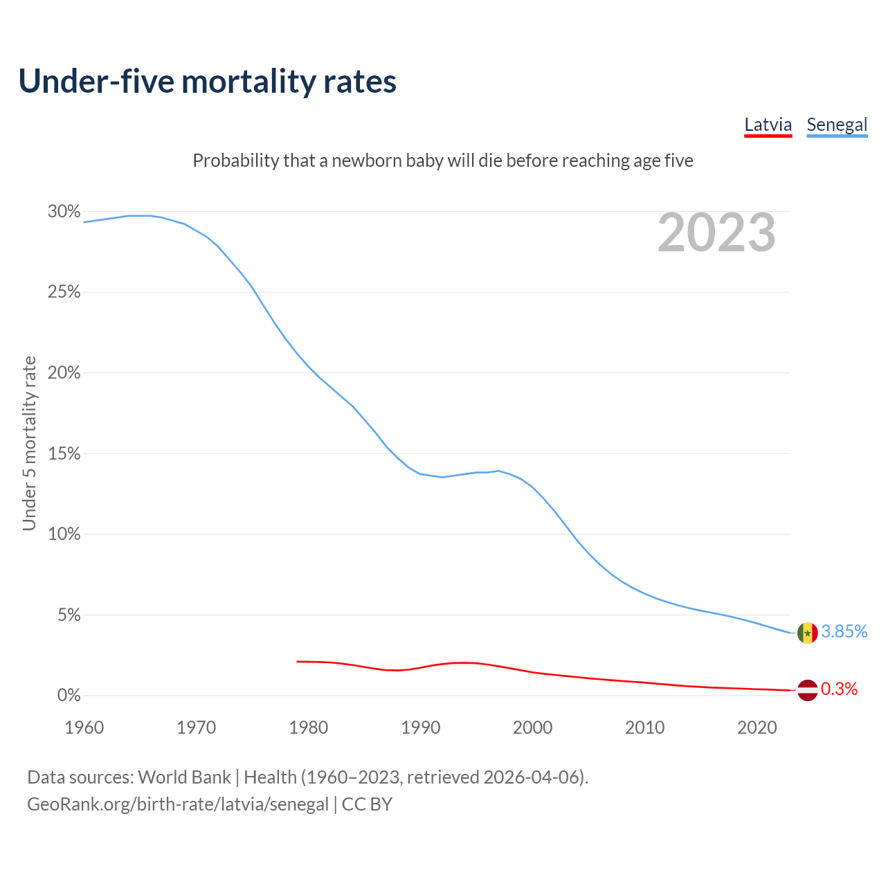 The chance that a newborn baby will die before reaching age five is 0.3% in Latvia and 3.85% in Senegal. Above is a chart with historical data on under-five mortality rates.