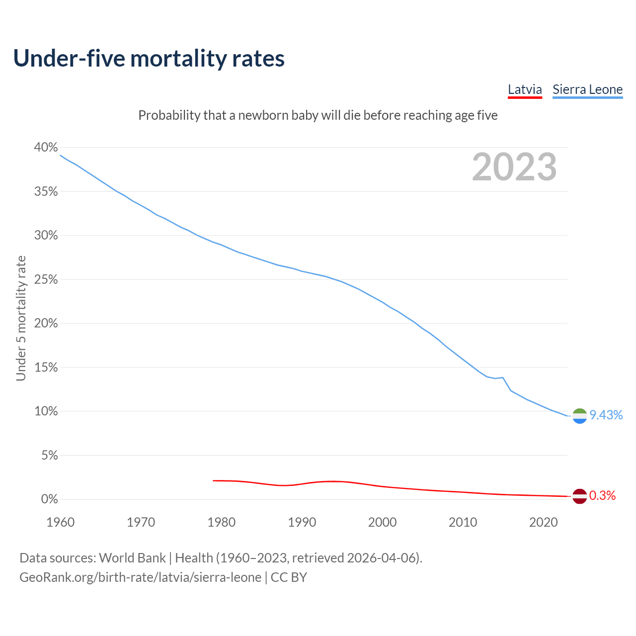 The chance that a newborn baby will die before reaching age five is 0.3% in Latvia and 9.43% in Sierra Leone. Above is a chart with historical data on under-five mortality rates.