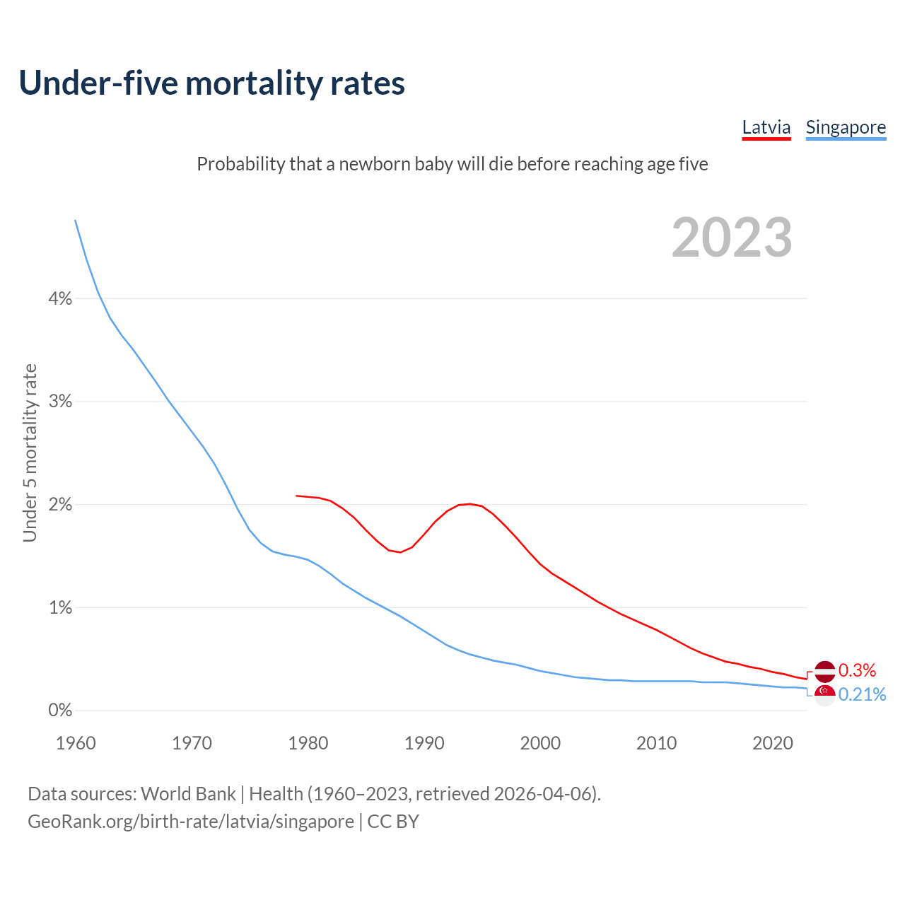The chance that a newborn baby will die before reaching age five is 0.3% in Latvia and 0.21% in Singapore. Above is a chart with historical data on under-five mortality rates.