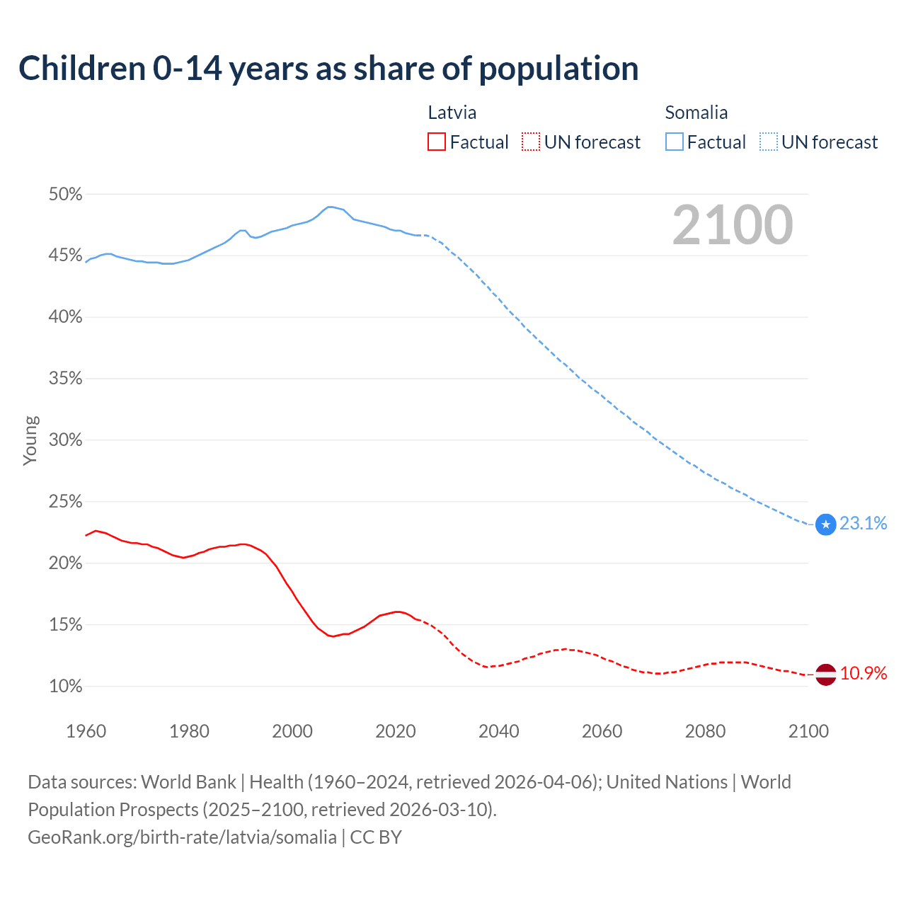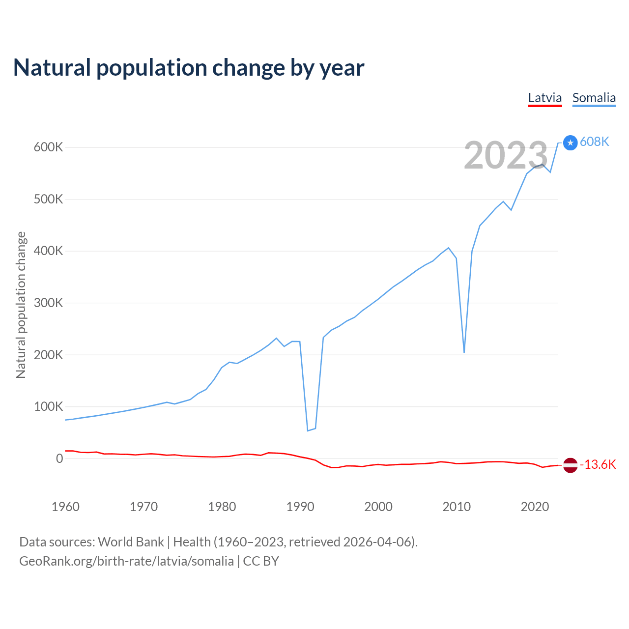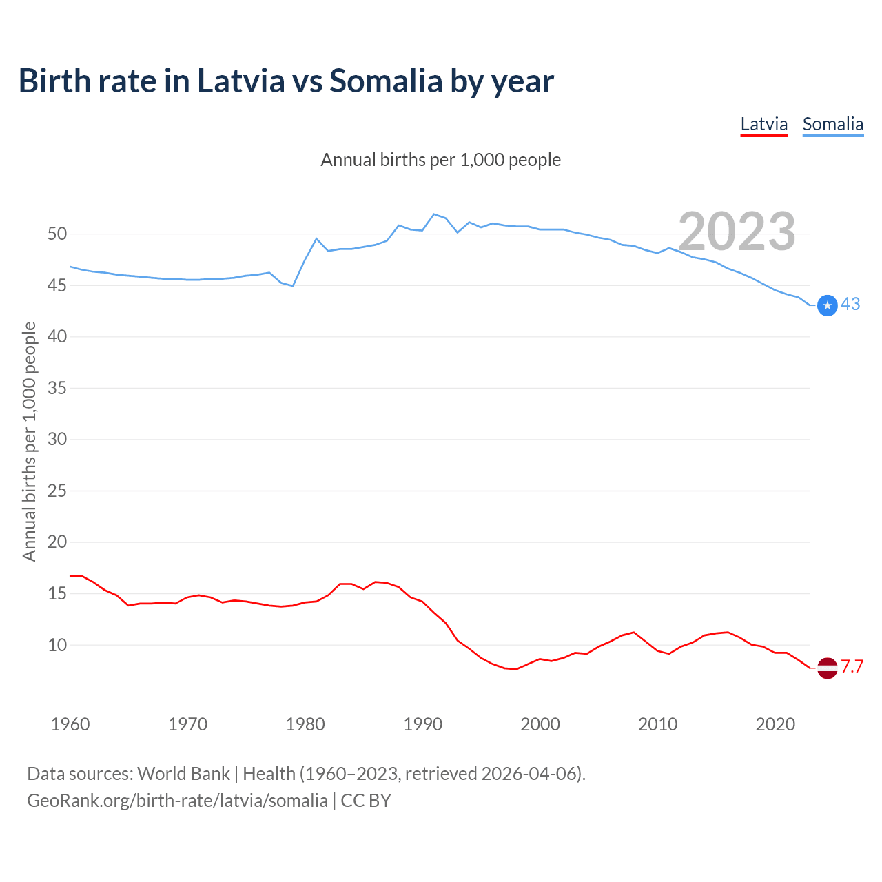 Latvia has an annual birth rate of 7.7 births per 1,000 people, compared to 43 for Somalia. The average number of children a woman is expected to have during her lifetime — the fertility rate, is 1.36 in Latvia and 6.13 in Somalia — 351% difference.