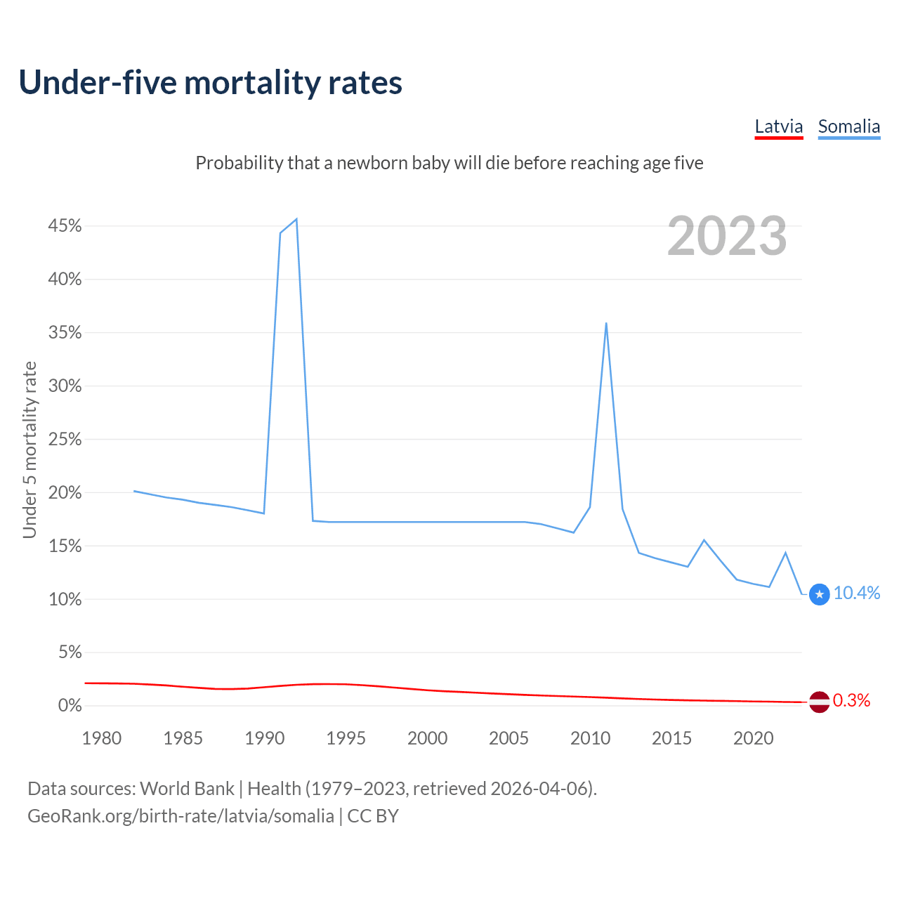 The chance that a newborn baby will die before reaching age five is 0.3% in Latvia and 10.4% in Somalia. Above is a chart with historical data on under-five mortality rates.