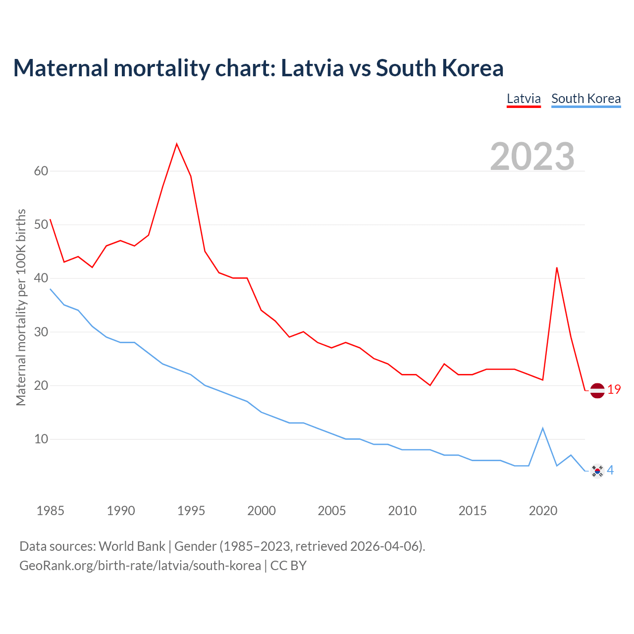 The maternal mortality rate, which is the probability of dying during childbirth or within 42 days of pregnancy termination, is 19 deaths per 100,000 live births in Latvia, compared to 4 deaths in South Korea.
