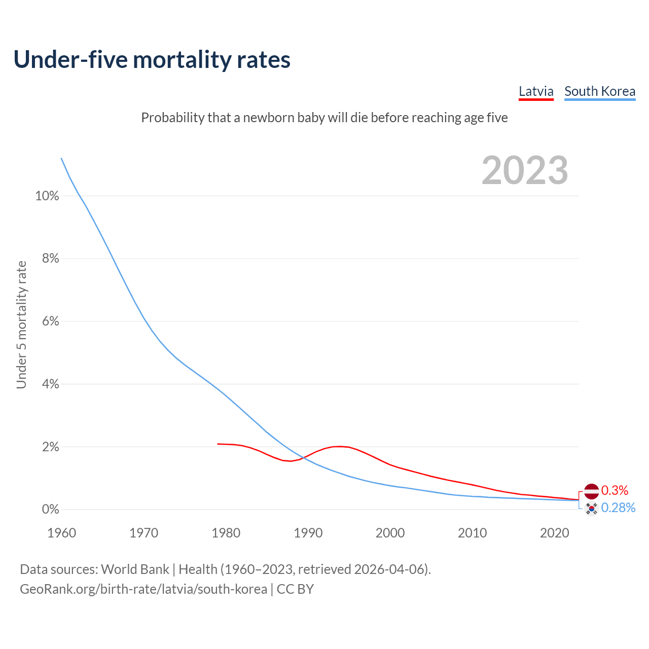 The chance that a newborn baby will die before reaching age five is 0.3% in Latvia and 0.28% in South Korea. Above is a chart with historical data on under-five mortality rates.