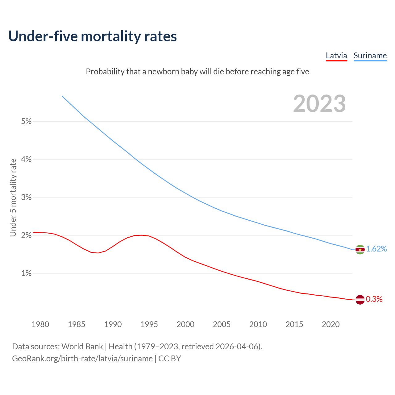 The chance that a newborn baby will die before reaching age five is 0.3% in Latvia and 1.62% in Suriname. Above is a chart with historical data on under-five mortality rates.
