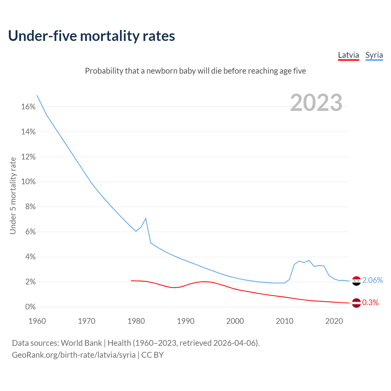 The chance that a newborn baby will die before reaching age five is 0.3% in Latvia and 2.06% in Syria. Above is a chart with historical data on under-five mortality rates.