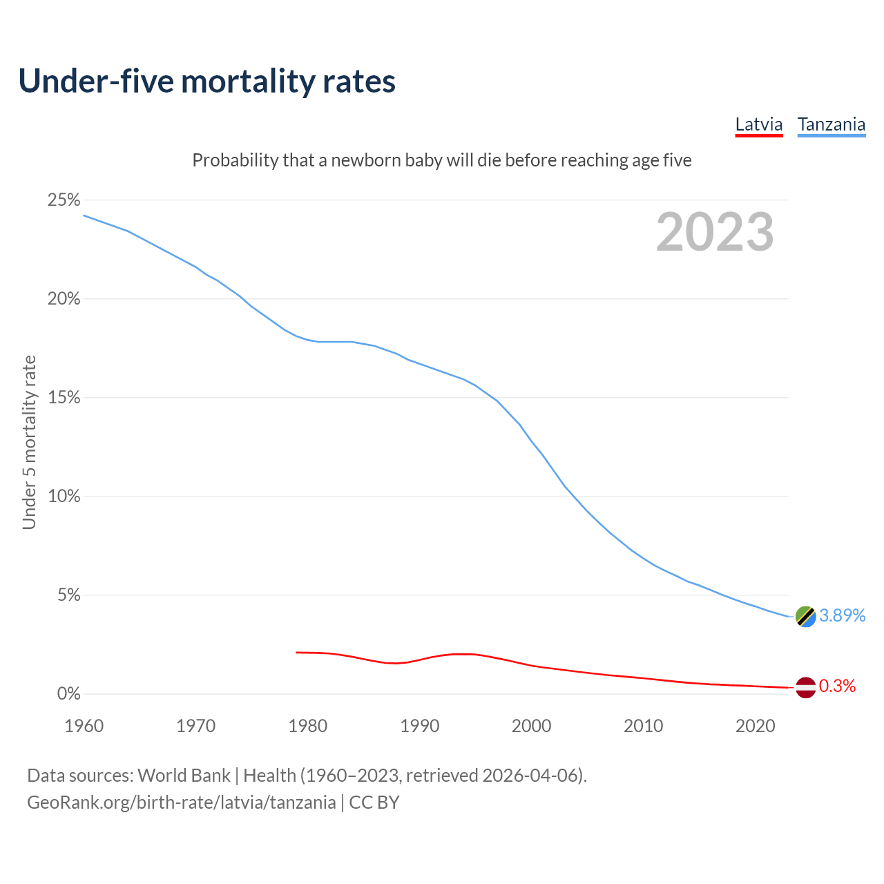 The chance that a newborn baby will die before reaching age five is 0.3% in Latvia and 3.89% in Tanzania. Above is a chart with historical data on under-five mortality rates.