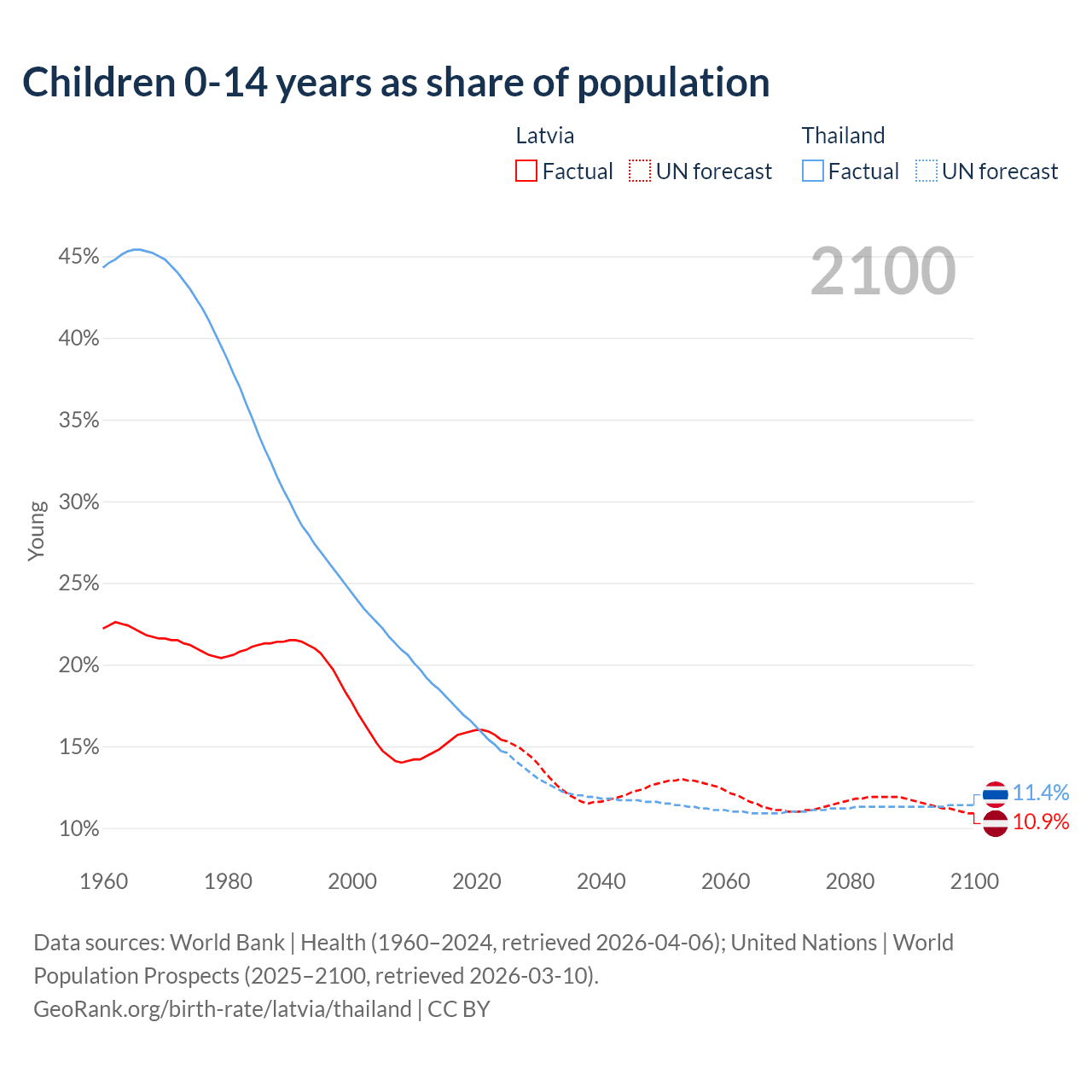 According to the latest available data on birth rates, the fertility rate in Latvia was 1.36 children per woman in 2023, compared to 1.21 in Thailand in 2023. The replacement level is considered to be 2.1 children per woman.