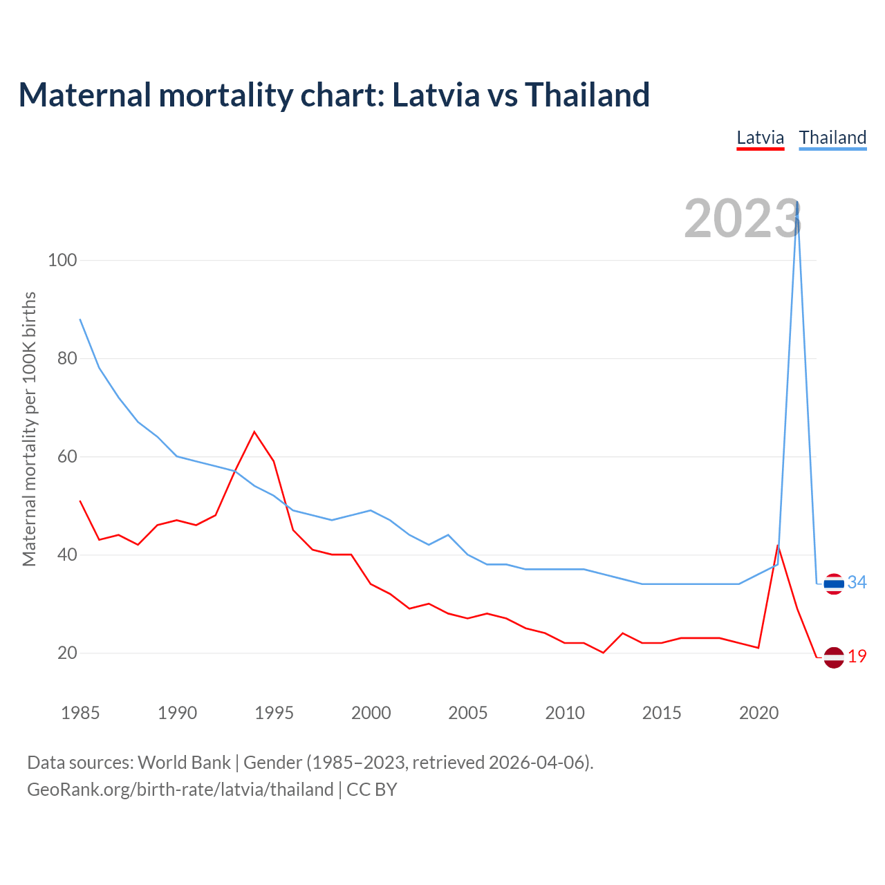 The maternal mortality rate, which is the probability of dying during childbirth or within 42 days of pregnancy termination, is 19 deaths per 100,000 live births in Latvia, compared to 34 deaths in Thailand.