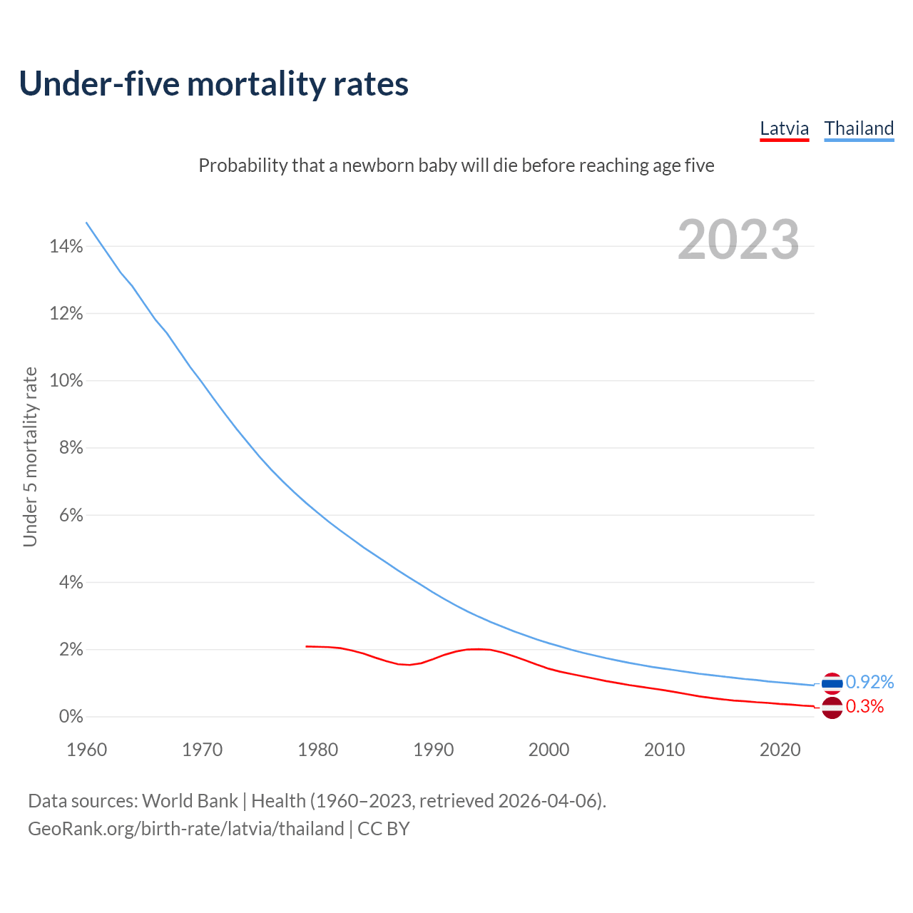 The chance that a newborn baby will die before reaching age five is 0.3% in Latvia and 0.92% in Thailand. Above is a chart with historical data on under-five mortality rates.