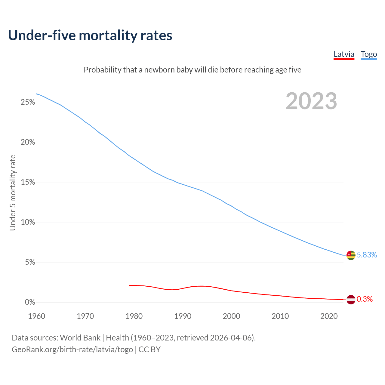 The chance that a newborn baby will die before reaching age five is 0.3% in Latvia and 5.83% in Togo. Above is a chart with historical data on under-five mortality rates.