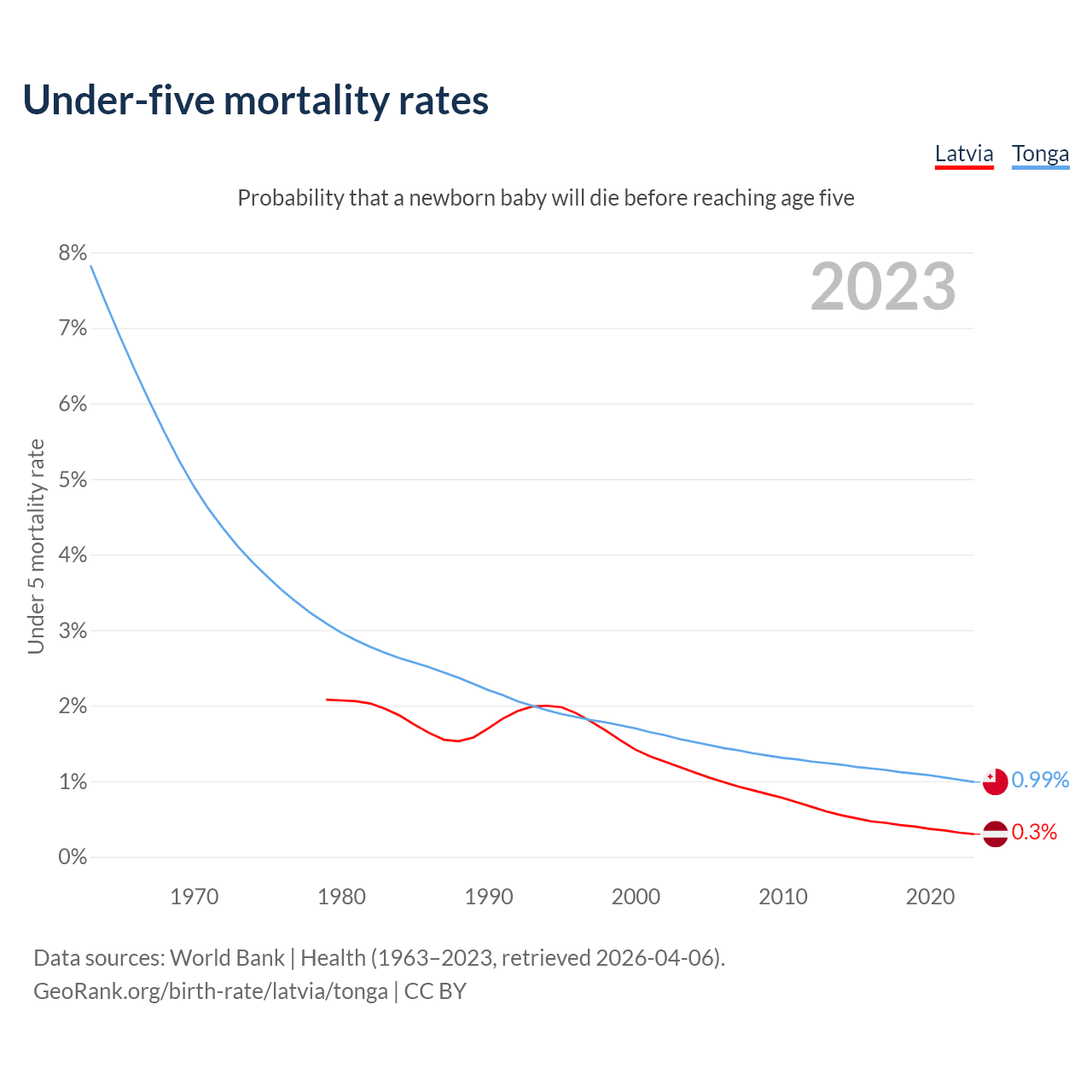 The chance that a newborn baby will die before reaching age five is 0.3% in Latvia and 0.99% in Tonga. Above is a chart with historical data on under-five mortality rates.