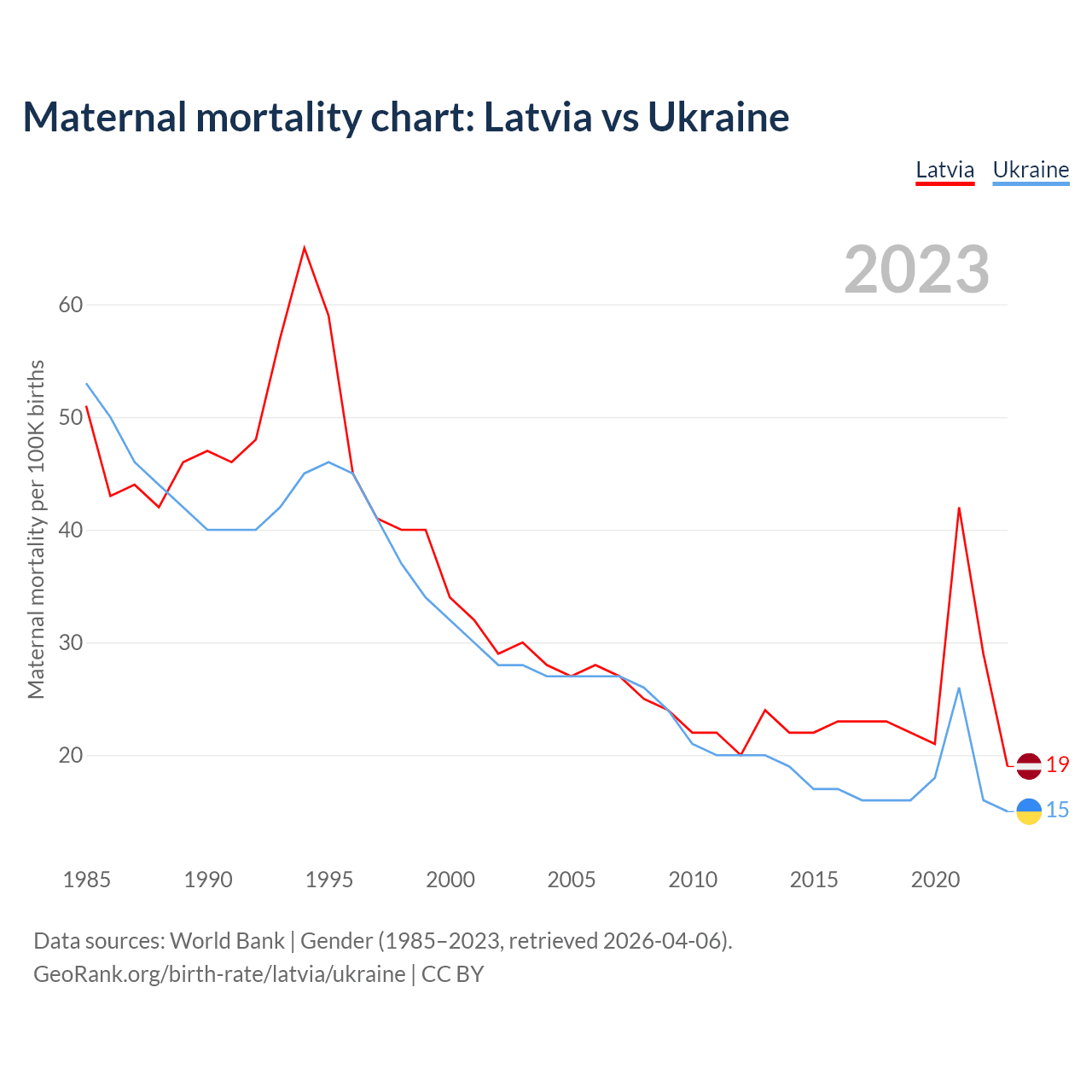 The maternal mortality rate, which is the probability of dying during childbirth or within 42 days of pregnancy termination, is 19 deaths per 100,000 live births in Latvia, compared to 15 deaths in Ukraine.