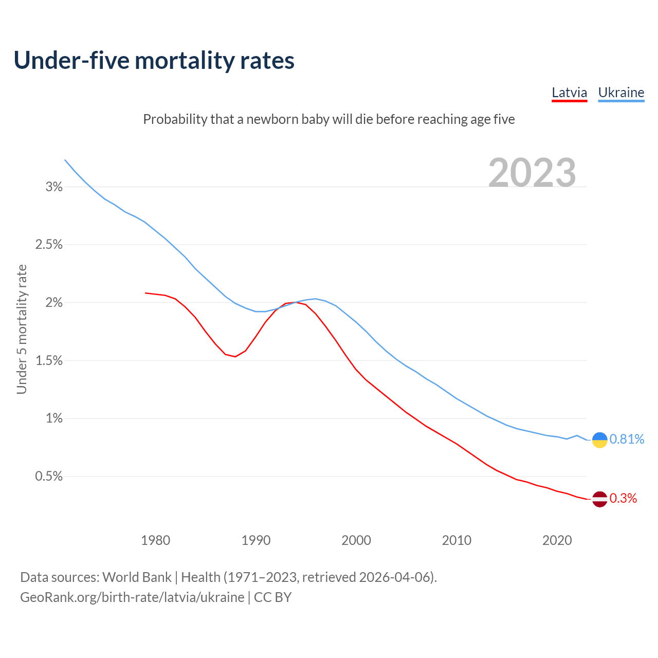 The chance that a newborn baby will die before reaching age five is 0.3% in Latvia and 0.81% in Ukraine. Above is a chart with historical data on under-five mortality rates.