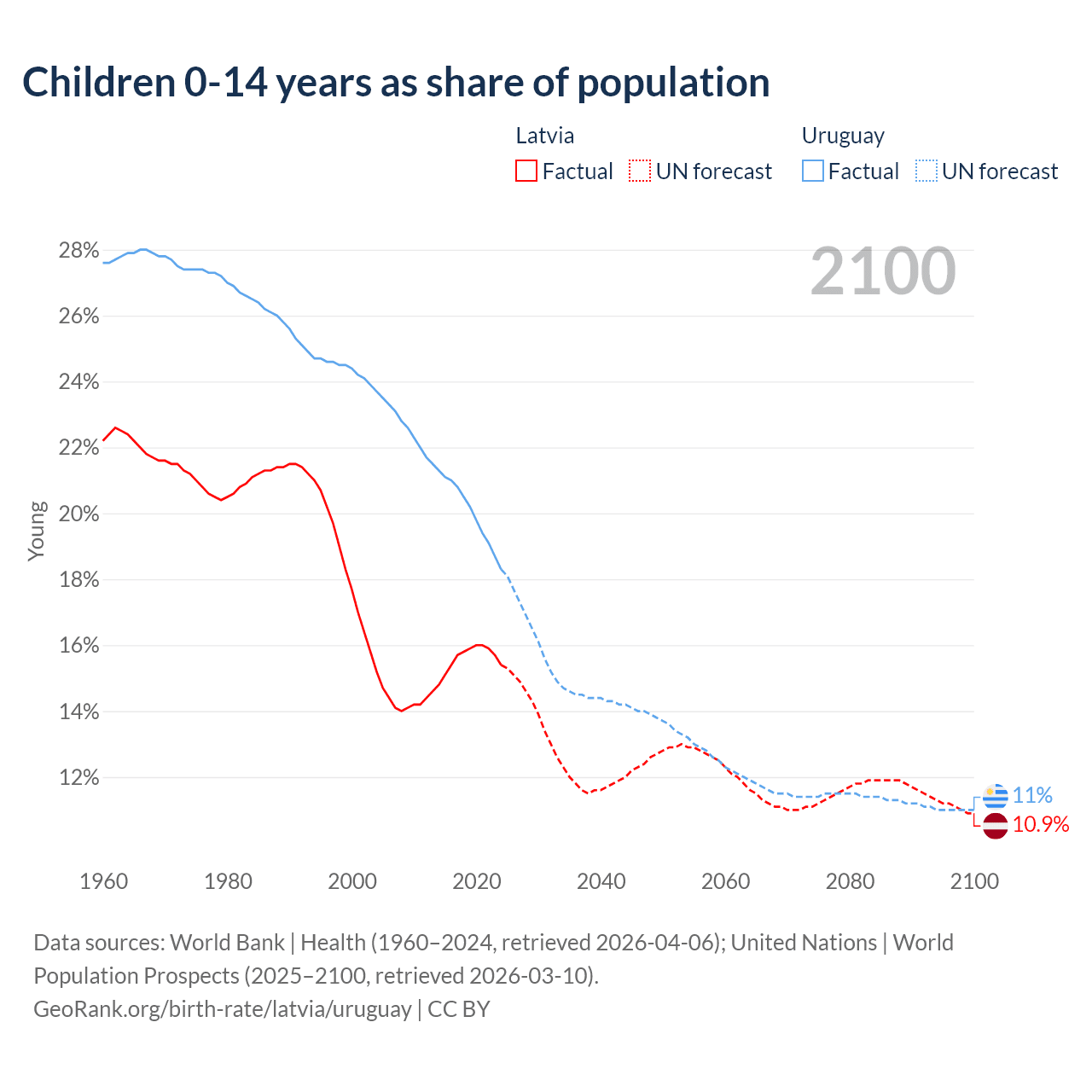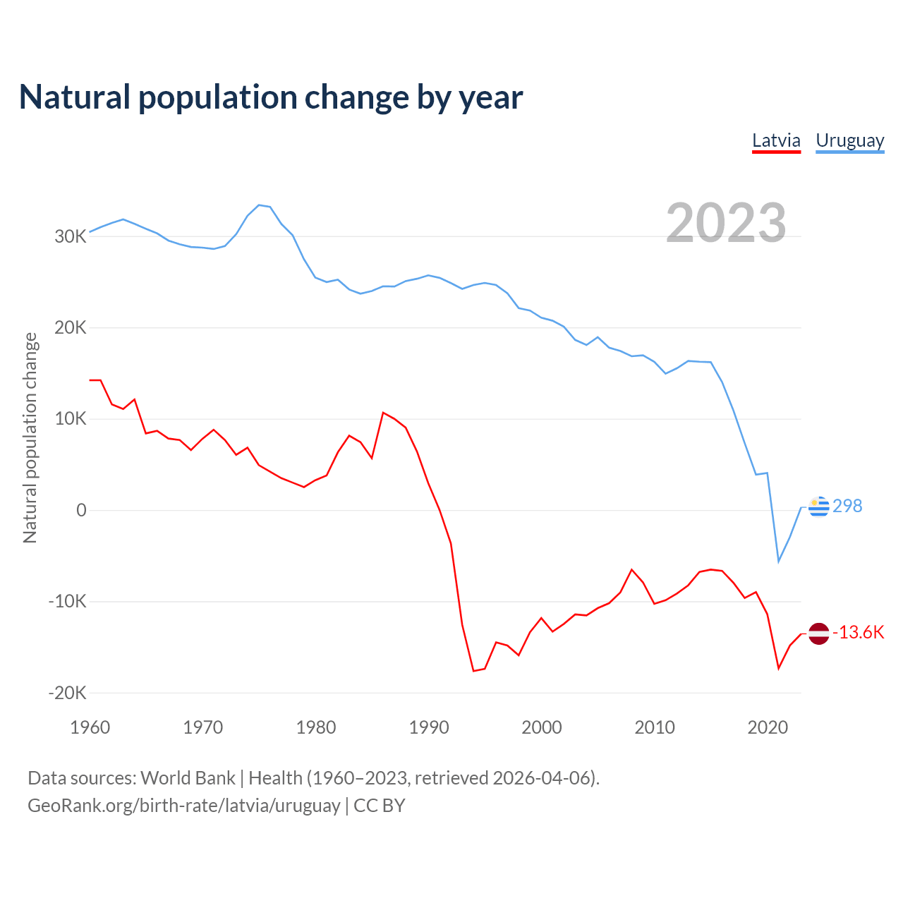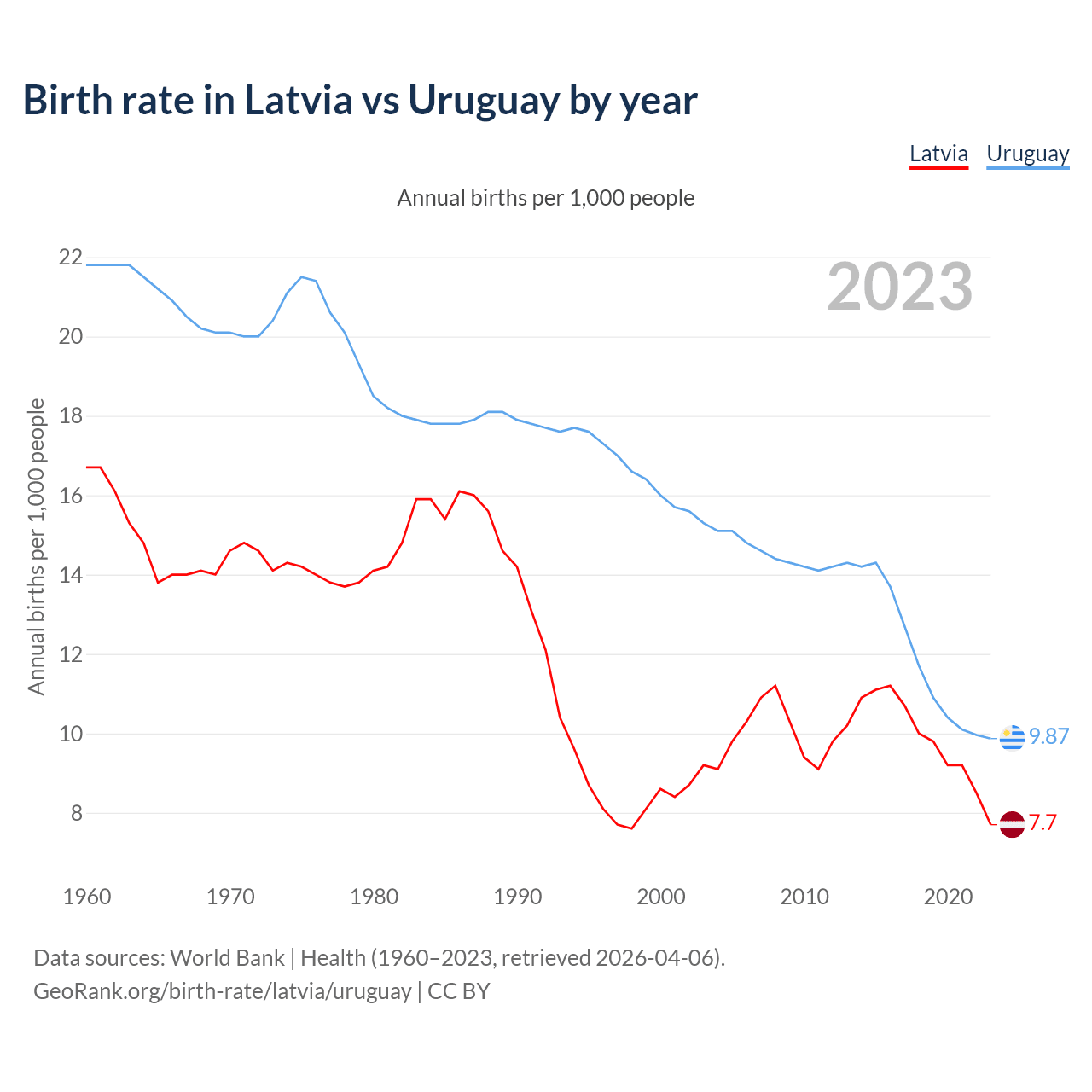 Latvia has an annual birth rate of 7.7 births per 1,000 people, compared to 9.87 for Uruguay. The average number of children a woman is expected to have during her lifetime — the fertility rate, is 1.36 in Latvia and 1.41 in Uruguay — 3.6% difference.